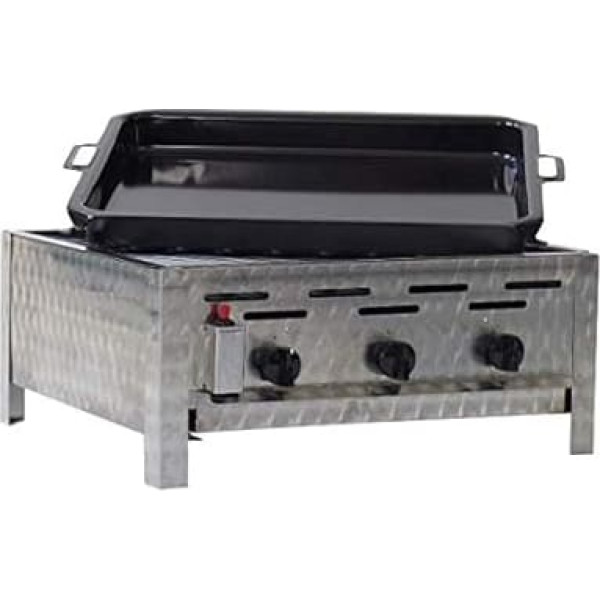Professional gastro roaster for propane gas (gas cylinder) with 11 kW power Grill surface: 59 x 47 cm – base dimensions pan: 59 x 48 cm Device dimensions: 65 x 53 x 27 cm (W x D x H) Made in Germany – extensive accessories available – spare parts available › See more product details; Product description Product description Made in Germany. Do you want to either grill on the grate or make delicious fried potatoes in the pan? Then this combination is just the right gastro roasting dish in stainless steel design, tabletop device, very stable housing made of 1 mm stainless steel, piezo igniter and thermal flame monitoring. Accessories: nickel-plated cooking grate, sturdy flame cover made of 1 mm stainless steel, grease drip tray, enamelled pan made of 2.75 mm deep drawn sheet steel, burner made of sheet steel, hose and regulator for private use. Please note the instructions for commercial use. Use in well-ventilated rooms is possible. Power: 11 kW, weight: 30 kg, 50 mbar, gas type propane/butane, DVGW and CE tested Legal Disclaimer Note for commercial use. According to BGV D34 (VBG 21) and TRF96, commercial use (e.g. at fairs), a hose break protection according to DIN 30 693 \; Product description Product description Made in Germany. Do you want to either grill on the grate or make delicious fried potatoes in the pan? Then this combination is just the right gastro roasting dish in stainless steel design, tabletop device, very stable housing made of 1 mm stainless steel, piezo igniter and thermal flame monitoring. Accessories: nickel-plated cooking grate, sturdy flame cover made of 1 mm stainless steel, grease drip tray, enamelled pan made of 2.75 mm deep drawn sheet steel, burner made of sheet steel, hose and regulator for private use. Please note the instructions for commercial use. Use in well-ventilated rooms is possible. Power: 11 kW, weight: 30 kg, 50 mbar, gas type propane/butane, DVGW and CE tested Legal Disclaimer Note for commercial use. According to BGV D34 (VBG 21) and TRF96, commercial use (e.g. at fairs), a hose break protection according to DIN 30 693 \; Product description Made in Germany. Do you want to either grill on the grate or make delicious fried potatoes in the pan? Then this combination is just the right gastro roasting dish in stainless steel design, tabletop device, very stable housing made of 1 mm stainless steel, piezo igniter and thermal flame monitoring. Accessories: nickel-plated cooking grate, sturdy flame cover made of 1 mm stainless steel, grease drip tray, enamelled pan made of 2.75 mm deep drawn sheet steel, burner made of sheet steel, hose and regulator for private use. Please note the instructions for commercial use. Use in well-ventilated rooms is possible. Power: 11 kW, weight: 30 kg, 50 mbar, gas type propane/butane, DVGW and CE tested Legal Disclaimer Note for commercial use. According to BGV D34 (VBG 21) and TRF96, commercial use (e.g. at fairs), a hose break protection according to DIN 30 693 \