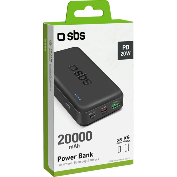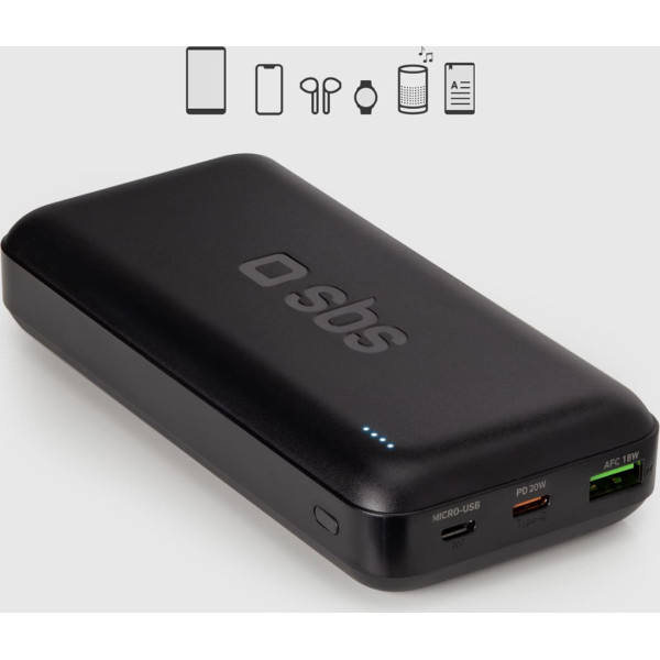 SBS Powerbank 20000 mAh PD USB-C USB-A Micro-USB 20W - melns