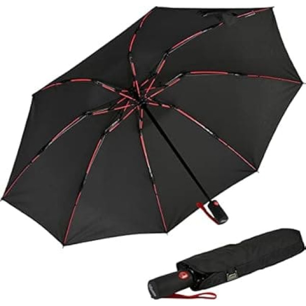 Large pocket umbrella with automatic open/close mechanism, with 106 cm diameter, suitable for large people, or couples. The wet side of the umbrella folds inwards when closed. This means that you are not dripped wet from the umbrella. It can then be placed in a space-saving manner, closed for drying. Thanks to the special fibreglass frame, the umbrella is very stable and little sensitive to wind and rust infestation. The automatic umbrella is opened at the touch of a button. If you press the release button again, the umbrella roof folds up by itself. The cover is made of 100% polyester. The umbrella length when closed is approx. 30 cm with a weight of approx. 360 g › See more product details