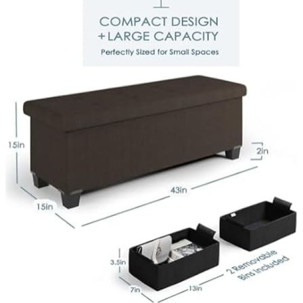Brown ottoman storage bench: This storage ottoman with storage space for living room decor transforms your space and reduces clutter, and can be used as a storage ottoman bench or ottoman footrest. Maximum weight: 660 lbs. Removable legs: Our ottoman with storage space for bedroom measures 43 inches L x 38.1 cm W x 38.1 cm H and folds flat when not in use. Adjust the height by adding or removing sturdy legs. Durable fabric ottoman: This storage bench for the bedroom end of the bed offers you a comfortable seat to put on socks and shoes and makes a statement as a side bench with storage space and seat. Sturdy lid: the padded lid of our entrance storage bench is comfortable and supportive. The invisible hinge design allows it to bend and lift from both sides without removing the entire lid. TWO REMOVABLE STORAGE BINS Keep small, loose items neatly organized with easy access storage bins and store bulkier items like throw blankets and pillows in the large ottoman space. › See more product details; Product description ottoman bench with storage bins 43 inch storage bench for bedroom bed end large ottoman footrest ottoman with storage space for living room bench with storage space max. 300kg Fabric Ottoman; Product description ottoman bench with storage bins 43 inch storage bench for bedroom bed end large ottoman footrest ottoman with storage space for living room bench with storage space max. 300kg Fabric Ottoman; ottoman bench with storage bins 43 inch storage bench for bedroom bed end large ottoman footrest ottoman with storage space for living room bench with storage space max. 300kg Fabric Ottoman