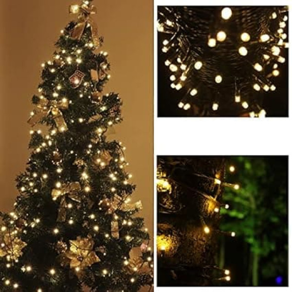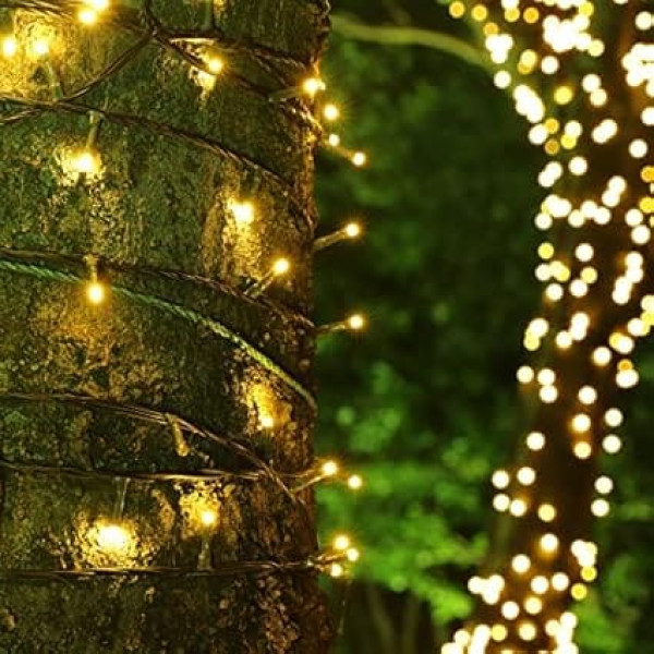300 LEDs light chain – light colour: warm white/total length: 31.5 m/lead cable: 1.5 m/bulb spacing: 10 cm IP44 waterproof: the latest waterproof battery compartment can be used indoors or outdoors Power supply: 4 x AA batteries (not included). Can last 60-80 hours with new battery. With 8 light effect modes, memory function, timer function › See more product details