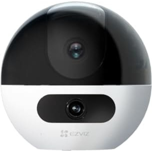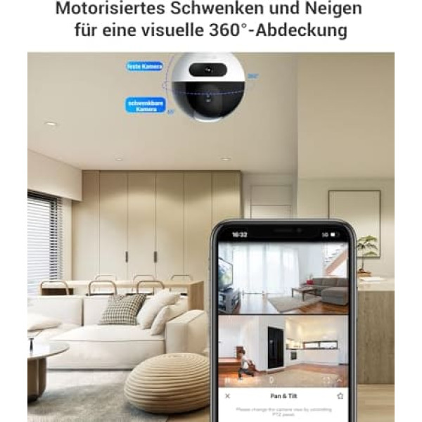 Double 2K+ resolution, 360° coverage: With the dual lens camera surveillance inside, you will get a complete overview of the interior. The top lens can be rotated horizontally 360° and vertically by 65°; the fixed lens at the bottom allows a wide angle of 108°, giving you the most detailed picture of your home PERSONAL & PET RECOGNITION, SMART TRACKING: Once your pet is detected, you will receive a notification. You can also activate the person recognition when someone enters the surveillance area of the fixed lens, the surveillance camera automatically tracks the target and sends you a notification Smart Patrolling Mode After activating auto cruise mode, the lens automatically rotates to record what is happening at home. You can also define the position of the patrol mode yourself, so that the pet camera rotates to the angle you defined with a fixed frequency for surveillance Mutual Calling by Hand Movement When your elderly parents want to make contact with you, they can simply wave into the swivel security camera inside to start a video call on your phone. This is the easiest way to start a video call Stable Network Connection, Clear Video: This indoor WiFi camera supports 2.4/5GHz dual band WiF6 connection, making the network connection more stable and easier. It is recommended to turn on WDR in a backlit environment. The image becomes clearer › See more product details