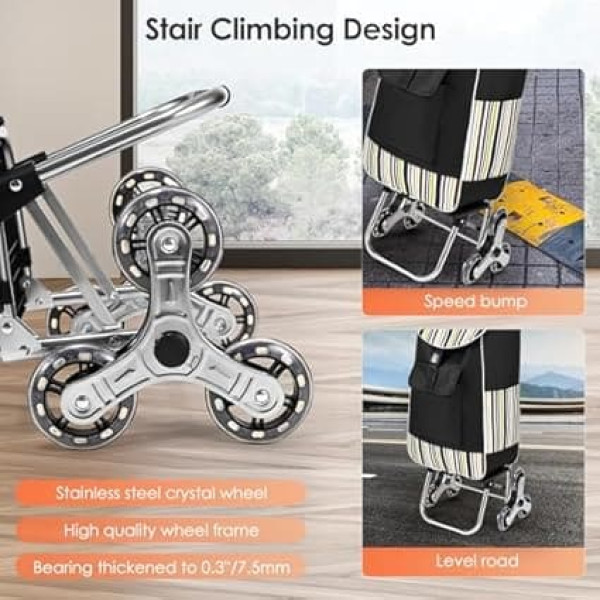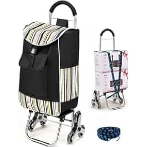 3 x 3 stair climbers: The stair climber trolley is made of stainless steel crystal wheels and 0.3 inches/7.5 mm thick bearings that easily climb the stairs even when fully loaded. Easy to overcome high curbs. Easy ride on buses and trains. 8.45gal/32L storage bag: The shopping trolley comes with a 32-litre storage bag with pockets on the front and back and on both sides that can hold a variety of items. It also has a PV layer and an insulating layer to keep your food fresh for longer. Multifunctional 2-in-1: This shopping trolley can be used as a shopping cart for storing and transporting items or as a separate trolley with removed bag. The trolley has a load capacity of 30 kg (66 lb) and is equipped with a 65 ft/165 cm long rope and a wider base to ensure additional stability and prevent items from falling off during transport. Easy to carry: The foldable shopping cart can be folded for easy storage and transport. You can take it to the supermarket for shopping, picnic or wherever you want. When not in use, the shopping trolley can be easily stored in a storage bag. Comfortable pushing and pulling: The padded handle provides you with a comfortable grip and ensures that you do not fatigue even during prolonged use. This shopping trolley is a reliable companion for your daily life. › See more product details