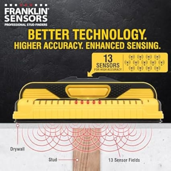 Higher accuracy, better technology: with 13 patented sensors, the M210 detects bolts more accurately Safety first live wire meter: the ProSensor M210 contains a live wire gauge for worry-free drilling SHOWS FULL WIDTH OF STUDS: wide LED display shows the center and edges of the bolt at the same time Deep scan, always on: the ProSensor M210 automatically adapts to depth, material and texture up to 4.3 cm BUILT TO LAST The ProSensor M210 stud finder has been rated by consumers and professionals and is both precise and durable › See more product details; Product description With a Franklin Sensors stud finder you have the fastest, easiest and most correct stud finder on the market. To operate the M210, simply press and hold the button, then place it on the wall and off you go. There is no calibration procedure. You can find studs immediately. Once you have it on the wall, the LEDs show you exactly where the bolt is. The M210 features an improved precision LED indicator. With 21 LEDs, the M210 identifies bolt more accurately. When you move the device back and forth, the M210 continues to track the position of the bolt, making it easy to see the edges and center of the bolt immediately. In addition, it can also find two studs at once. Franklin Sensors stud finders are the most accurate stud finders because they have more sensors. Other stud finders typically have only 1 or 2 sensors. The M210 has 13. With Franklin Sensors patented technology, you can find bolt positions with unbeatable accuracy. The M210 can also identify live wires. The M210 also features a built-in spirit level and a handy pen tray to make it the perfect tool for many projects, from hanging and leveling pictures to installing cabinets and flat panel TVs. Once you have tried the M210, Franklin Sensors stud finder will quickly become your favorite. Franklin Sensors stud finders are proudly made in the USA.; Product description With a Franklin Sensors stud finder you have the fastest, easiest and most correct stud finder on the market. To operate the M210, simply press and hold the button, then place it on the wall and off you go. There is no calibration procedure. You can find studs immediately. Once you have it on the wall, the LEDs show you exactly where the bolt is. The M210 features an improved precision LED indicator. With 21 LEDs, the M210 identifies bolt more accurately. When you move the device back and forth, the M210 continues to track the position of the bolt, making it easy to see the edges and center of the bolt immediately. In addition, it can also find two studs at once. Franklin Sensors stud finders are the most accurate stud finders because they have more sensors. Other stud finders typically have only 1 or 2 sensors. The M210 has 13. With Franklin Sensors patented technology, you can find bolt positions with unbeatable accuracy. The M210 can also identify live wires. The M210 also features a built-in spirit level and a handy pen tray to make it the perfect tool for many projects, from hanging and leveling pictures to installing cabinets and flat panel TVs. Once you have tried the M210, Franklin Sensors stud finder will quickly become your favorite. Franklin Sensors stud finders are proudly made in the USA.; With a Franklin Sensors stud finder you have the fastest, easiest and most correct stud finder on the market. To operate the M210, simply press and hold the button, then place it on the wall and off you go. There is no calibration procedure. You can find studs immediately. Once you have it on the wall, the LEDs show you exactly where the bolt is. The M210 features an improved precision LED indicator. With 21 LEDs, the M210 identifies bolt more accurately. When you move the device back and forth, the M210 continues to track the position of the bolt, making it easy to see the edges and center of the bolt immediately. In addition, it can also find two studs at once. Franklin Sensors stud finders are the most accurate stud finders because they have more sensors. Other stud finders typically have only 1 or 2 sensors. The M210 has 13. With Franklin Sensors patented technology, you can find bolt positions with unbeatable accuracy. The M210 can also identify live wires. The M210 also features a built-in spirit level and a handy pen tray to make it the perfect tool for many projects, from hanging and leveling pictures to installing cabinets and flat panel TVs. Once you have tried the M210, Franklin Sensors stud finder will quickly become your favorite. Franklin Sensors stud finders are proudly made in the USA.