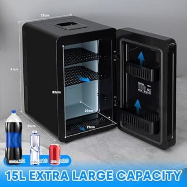 Spacious capacity of 15 litres: its spacious interior, this mini fridge is designed for storing a variety of items. Generous capacity allows you to store multiple cans, snacks and even skin care products (for example, up to 20 cans of 355 ml drinks can be stored in it.) 【Efficient Cooling & Heat Modes】Advanced dual-core technology, this refrigerator can highly efficiently cool items to 22-25°C below ambient temperature or heat to 55±5°C. Easily switch between cooling and heat modes to store your drinks, snacks and essentials exactly the way you like them! Practical and portable: Four removable shelves and baskets allow flexible organisation. The collection basin catches condensation or spills and ensures that your fridge stays clean and dry. Easily transport your mini fridge wherever you need it with the practical integrated handle. Perfect for dormitories, offices, garages and outdoor travel. AC 220 V / DC 12 V adaptor: AC 220 V power cable for standard socket, DC 12 V power cable for 12 V cigarette lighter in the vehicle. Makes this portable fridge perfect for dormitories, offices, garages and outdoor travel. Environmentally friendly and safe: advanced safety technology, intelligent semiconductor chip, 100% free of freon, environmentally friendly. If you have any questions during use, please contact us in time and we will reply you within 24 hours › See more product details
