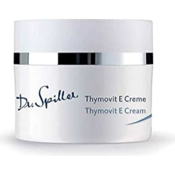 With Thymovit E cream, impurities of mature skin are eliminated and natural skin regeneration is supported. A rich Thymus vulgaris extract has an antibacterial and anti-inflammatory effect, stimulates blood circulation and gives the skin the opportunity to detoxify better. In addition, the elasticity of the skin is improved for a balanced and nourished complexion. Ingredients: Aqua (Water), Hydrogenated Polydecene, Ethylhexyl Stearate, Tocopheryl Acetate, Polyglyceryl-2 Sesquiisostearate, Glycerin, Disteardimonium Hectorite, Stearalkonium Hectorite, Cera Alba... Dr. Spiller Pure SkinCare Solutions offers care cosmetics at the highest level for use at home. Following the model of nature, our exclusive cosmetic products are refined with tradition and innovation to the highest effectiveness › See more product details; Product description Dr. Spiller - Thymovit E Cream With Thymovit E cream, impurities of mature skin are removed and natural skin regeneration is supported. A rich Thymus vulgaris extract has an antibacterial and anti-inflammatory effect, stimulates blood circulation and gives the skin the opportunity to detoxify better. In addition, the elasticity of the skin is improved for a balanced and nourished complexion. Application: Care for the face, neck and décolleté in the morning and evening after cleansing and individual intensive care, then apply Thymovit E cream.; Product description Dr. Spiller - Thymovit E Cream With Thymovit E cream, impurities of mature skin are removed and natural skin regeneration is supported. A rich Thymus vulgaris extract has an antibacterial and anti-inflammatory effect, stimulates blood circulation and gives the skin the opportunity to detoxify better. In addition, the elasticity of the skin is improved for a balanced and nourished complexion. Application: Care for the face, neck and décolleté in the morning and evening after cleansing and individual intensive care, then apply Thymovit E cream.; Dr. Spiller - Thymovit E Cream With Thymovit E cream, impurities of mature skin are removed and natural skin regeneration is supported. A rich Thymus vulgaris extract has an antibacterial and anti-inflammatory effect, stimulates blood circulation and gives the skin the opportunity to detoxify better. In addition, the elasticity of the skin is improved for a balanced and nourished complexion. Application: Care for the face, neck and décolleté in the morning and evening after cleansing and individual intensive care, then apply Thymovit E cream.