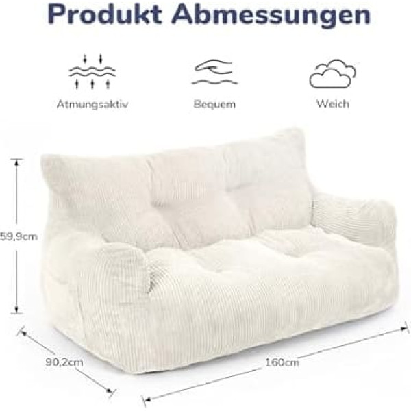 Wide seating area: With a seat that offers comfortable space for two adults, this bean bag chair is perfect for cosy hours with your partner, family or for guests Experience comfort: the surface of the bean bag chair is made of soft, skin-friendly corduroy. The interior is filled with highly elastic sponge to ensure strength and durability Detailed design: the adult bean bag has a portable handle for easy carrying anywhere, side pockets for storing controllers/magazines and a non-slip rubber base for stability and combines comfort and functionality Ergonomic design: the backrest, armrests and leg supports of the bean bag sofa adapt to the curves of your body. Whether you are relaxing, reading or watching TV, this bean bag chair offers you ultimate comfort and relaxation Suitable for different rooms: Pamapic bean bag can be used in different rooms such as living room, bedroom, playroom and study. No assembly required: simply remove from the compressed packaging and it is ready to use › See more product details