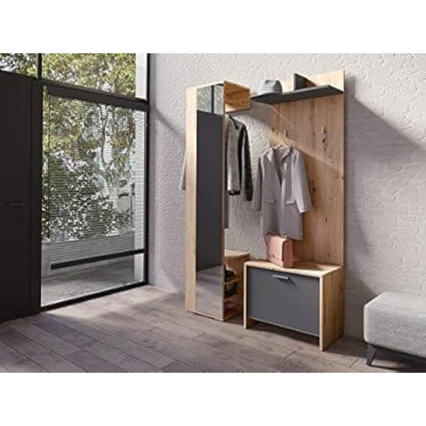 Practical bench with flap, behind it there are 2 shelves Melamine-coated body in modern Artisan oak look, combined with anthracite-coloured front The shoe cabinet has a practical plastic handle in silver colour The hallway bench can hold up to 80 kg As the byLiving team is committed to sustainability, the cabinet is made from FSC-certified wood materials. Dimensions: W 60, H 48, D 35 cm › See more product details; Product description Product Description byLIVING Ben modern bench with storage space. The practical Ben bench impresses with its high-quality workmanship and modern, extraordinary design. The bench has a flap behind which two compartments hide for extra storage. The shelf behind the flap, as well as the flap itself are painted in anthracite and the body is designed in an artisan oak look. The flap has a practical handle in silver and allows easy opening of the shelf. The bench can hold up to 80 kg and you can sit comfortably on it when putting on shoes. Alternatively, the bench is also suitable as a storage surface and can be combined perfectly with the Ben 02 coat rack panel (see photos). Thanks to the included assembly instructions, the bench can be assembled quickly and easily. The surfaces are easy to clean and can be cleaned particularly well with a damp cloth. Matching the bench, there are great other furniture that round off the design of your room, such as a tall cabinet with mirror, a wall panel, a shoe cabinet and a sideboard. The wood materials used come from responsible sources and are FSC certified. Dimensions: W 60, H 48, D 35 cm. Technical details: 1 folding door silver-coloured plastic. Handles melamine Artisan oak look / anthracite. Care instructions: CarCarCarCardust dust With Clean with a soft, clean, damp cloth. Clean without abrasives such as powder, steel wool or solvents. All measurements are approximate. Safety Warning Warning: maximum load 80 kg. Fully assemble before first use and make sure the bench is stable. Dust regularly and clean with a soft, clean, damp cloth to ensure the longevity of the bench.; Product description Product Description byLIVING Ben modern bench with storage space. The practical Ben bench impresses with its high-quality workmanship and modern, extraordinary design. The bench has a flap behind which two compartments hide for extra storage. The shelf behind the flap, as well as the flap itself are painted in anthracite and the body is designed in an artisan oak look. The flap has a practical handle in silver and allows easy opening of the shelf. The bench can hold up to 80 kg and you can sit comfortably on it when putting on shoes. Alternatively, the bench is also suitable as a storage surface and can be combined perfectly with the Ben 02 coat rack panel (see photos). Thanks to the included assembly instructions, the bench can be assembled quickly and easily. The surfaces are easy to clean and can be cleaned particularly well with a damp cloth. Matching the bench, there are great other furniture that round off the design of your room, such as a tall cabinet with mirror, a wall panel, a shoe cabinet and a sideboard. The wood materials used come from responsible sources and are FSC certified. Dimensions: W 60, H 48, D 35 cm. Technical details: 1 folding door silver-coloured plastic. Handles melamine Artisan oak look / anthracite. Care instructions: CarCarCarCardust dust With Clean with a soft, clean, damp cloth. Clean without abrasives such as powder, steel wool or solvents. All measurements are approximate. Safety Warning Warning: maximum load 80 kg. Fully assemble before first use and make sure the bench is stable. Dust regularly and clean with a soft, clean, damp cloth to ensure the longevity of the bench.; Product Description byLIVING Ben modern bench with storage space. The practical Ben bench impresses with its high-quality workmanship and modern, extraordinary design. The bench has a flap behind which two compartments hide for extra storage. The shelf behind the flap, as well as the flap itself are painted in anthracite and the body is designed in an artisan oak look. The flap has a practical handle in silver and allows easy opening of the shelf. The bench can hold up to 80 kg and you can sit comfortably on it when putting on shoes. Alternatively, the bench is also suitable as a storage surface and can be combined perfectly with the Ben 02 coat rack panel (see photos). Thanks to the included assembly instructions, the bench can be assembled quickly and easily. The surfaces are easy to clean and can be cleaned particularly well with a damp cloth. Matching the bench, there are great other furniture that round off the design of your room, such as a tall cabinet with mirror, a wall panel, a shoe cabinet and a sideboard. The wood materials used come from responsible sources and are FSC certified. Dimensions: W 60, H 48, D 35 cm. Technical details: 1 folding door silver-coloured plastic. Handles melamine Artisan oak look / anthracite. Care instructions: CarCarCarCardust dust With Clean with a soft, clean, damp cloth. Clean without abrasives such as powder, steel wool or solvents. All measurements are approximate. Safety Warning Warning: maximum load 80 kg. Fully assemble before first use and make sure the bench is stable. Dust regularly and clean with a soft, clean, damp cloth to ensure the longevity of the bench.