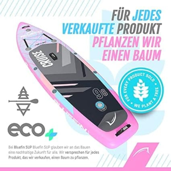 Award winning British design. Bluefin uses ESL fused PVC on the strongest and most versatile all-round paddleboard on the market. This comprehensive Bluefin Cruise SUP package is in our new pink colorway. We plant a tree for every purchase. The environment is at the heart of everything we do. We strive to use recycled materials in the manufacture of our products, and plant a tree for every purchase. Improved safety. The new Cruise has patent pending, reflective D-rings for added safety. An ankle leash with a comfortable neoprene wrapped webbing and a rolled-up TPR cord is included in every SUP package. The single chamber pump Swift Pro ABS. Makes it easier to inflate and deflate your SUP. This pump features a single and dual action option for quick inflation. Removable handles make this pump even more compact and portable. Includes paddle. This three-piece paddle consists of a new rubberised handle, a lightweight fibreglass shaft and a glass-filled nylon blade for less water resistance, more glide and smoother, more efficient paddle strokes. Environmentally friendly packaging. We use recyclable materials for our packaging. Inflatable SUPs and accessories are safely packaged in 100% recycled paper. For accessories such as the pump, we use non-woven fabric bags that are recyclable. Portable and travel-safe. The robust backpack ensures that your SUPs always stay safe when travelling. The backpack is fully padded and has comfortable carrying straps and the main compartment has inner straps for tiing. All-inclusive paddleboard accessories. Our comprehensive package contains everything you need for paddle fun. Includes paddle, 2+1 smart lock fin system, safety leash, waterproof phone bag, repair kit and Swift Pro pump. Who is this SUP for? The 9'8 is suitable for smaller adults/children. The streamlined shape is designed for fast and stable paddling and the 2+1 smart lock fin system ensures maximum stability. Why Bluefin? Join the SUP community with our award-winning range of paddleboards for adults and children. All our boards are designed and patented in the UK and come with a 5 year warranty as standard. Show More › See more product details