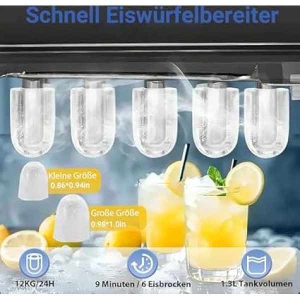 Quick ice cube maker: this ice cube maker with handle makes 9 ice cubes in 6 minutes, and with a 1.3 litre water tank and a powerful compressor, the ice cube maker can make up to 12 kg of ice every 24 hours. Say goodbye to long waiting times and enjoy a constant supply of ice whenever you need it 2 sizes of ice cubes: with this ice cube maker, you can make two different sizes of ice cubes. Small ice cubes are great for keeping seafood or beer fresh and cool for a longer period of time. Large ice cubes are better suited for preparing cold drinks for perfectly chilled drinks Easy to use: Equipped with advanced sensors, this ice maker has two indicators (\