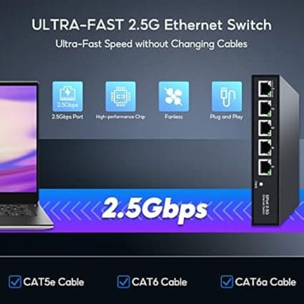 2.5G multi-gigabit switch: 5 x 2.5G BASE-T ports (100M/1G/2.5G), more suitable for 2.5G network devices such as 2.5G WiFi 6 AP, 2.5G NAS, 2.5G PCIe adapter, 2.5G server, gaming computer, 4K video and more. 128G switching capacity: 2.5 times faster than a Gigabit switch, provides a switching capacity of 128 Gbps, higher and faster configurations, ideal for home entertainment, 4K video, LAN parties or SOHO PRO users. Plug and play: the Sodola 2.5G switch is easy to set up without the need for software installation or configuration. Hassle-free wiring: no upgrade to Cat6 wiring required. Instantly upgrade to 2.5 Gbps of performance, reducing cabling costs and effort. After-Sale Service: We are committed to providing a product replacement without repair service within one year to attach more importance to your user experience. › See more product details