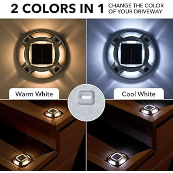Double colour mode: 2 colours in 1 (warm or white), so that the solar deck lights can not only be on driveway, warning level lights and guide lights, but also as outdoor decoration lights to decorate your home, garden and patio. Two-tone modes fit perfectly for different decoration styles Quick and easy to use: it consists of monocrystalline silicone solar panels and uses large battery (600 mAh). Our solar lamp supports 20 hours after 4-5 hours charging time in full sunlight. No need to control manually, these solar lights will automatically turn on at dusk and turn off at dawn. IP68 waterproof design and a tightly sealed battery compartment, it is super waterproof, frost-resistant, heat-resistant. Aluminium alloy housing can withstand durable enough and up to 3 tons of weight. You don't have to worry about cars and children. Easy to install: simply open the switch first and attach with the screws or place directly on the floor! If you encounter product problems, please contact us in time and we will help you solve the problem within 24 hours. Your satisfaction is always our goal. Warm tips: In winter to achieve optimal performance, remove snow or dirt accumulation from the solar panels. If the sun is not enough, the lighting time is greatly shortened. › See more product details