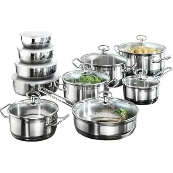 High-quality stainless 18/10 stainless steel with satin stripes Superset consist of a saucepan (14cm) pot (16 +18 +20 +22 cm), Braising pan fry (22cm), matching glass lid for every pot, 4 stainless steel bowls (13 +15 +18 + 20cm) with lockable lids Capsule bottom with heat conduction protection - suitable for induction Glass lid with steam outlet for vitamin-saving cooking Dishwasher safe High-quality stainless 18/10 stainless steel with satin stripes Superset consist of a saucepan (14cm) pot (16 +18 +20 +22 cm), Braising pan fry (22cm), matching glass lid for every pot, 4 stainless steel bowls (13 +15 +18 + 20cm) with lockable lids Capsule bottom with heat conduction protection - suitable for induction Glass lid with steam outlet for vitamin-saving cooking Dishwasher safe Show More › See more product details