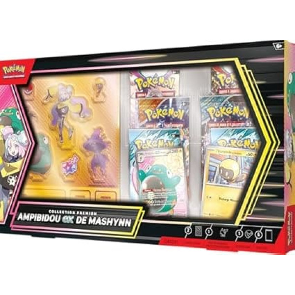 Featuring Ampibidou-ex by Mashynn as a fully illustrated glossy promo card and Mashynn's Têtampoule as a glossy card, this premium collection will electrify your game! This unique set includes a new Mashynnn photo sticker featuring Ampibidou and 6 random booster packs from the Pokémon TCG. Each booster contains 10 cards and 1 base energy. The cards vary depending on the booster! Set the scene for the Levalendura Arena Champion with the 7 acrylic figures from Mashynn, Ampibidou, Feuford, Têtampoule, Zapetrel, a Pokéball and the symbol of Mashynn. The whole thing accompanied by a double-sided decoration. Also includes 1 code card for the Pokémon Live TCG This collection is the ideal gift for anyone who likes to play or collect cards. › See more product details; Product description Featuring Ampibidou-ex by Mashynn as a fully illustrated glossy promo card and Mashynn's Têtampoule as a glossy card, this premium collection will electrify your game!; Product description Featuring Ampibidou-ex by Mashynn as a fully illustrated glossy promo card and Mashynn's Têtampoule as a glossy card, this premium collection will electrify your game!; Featuring Ampibidou-ex by Mashynn as a fully illustrated glossy promo card and Mashynn's Têtampoule as a glossy card, this premium collection will electrify your game!
