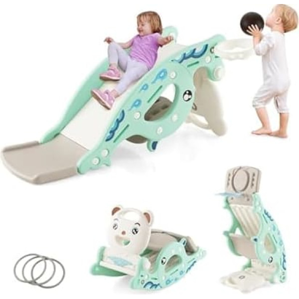 4-in-1 Kids Playground: equipped with basketball and 3 rings, this toy offers children various entertainment options such as sliding, basketball, swings and ring throwing. Child-friendly rocking horse: the handrail and the side railings of the rocking horse give children safety. A comfortable seat and considerate foot pedals ensure comfortable sitting. High Quality Material & Sturdy Construction: Made of PE, the multifunctional slide play set is durable. The sturdy triangular structure and multi-point support ensure high stability and a load capacity of 50 kg. Space Saving Design The convertible toddler slide features acceleration, deceleration and buffer zones. The basketball stand with folding basket allows for space-saving storage. FUN & EDUCATIONAL TOY With attractive design, this 4-in-1 slide and rocking toy is an ideal gift for children aged 3+. The different games provide hours of entertainment. › See more product details; Product description Description: Give your children more fun discovering with our 4-in-1 slide and rocking toy! Made of high-quality PE material, the multifunctional slide play set is characterised by excellent durability and robustness. In addition, the children's slide features a convertible design that is available in three modes - rocking horse, toddler slides and basketball stand. The slide also has built-in devices for ring throwing and playing basketball. And the reasonable zone design ensures a safe and fun slipping experience. More importantly, the gently rocking rocking horse features an ergonomic handrail and seat for safe use. Features: Easily converts into a rocking horse, children's slide and basketball stand Allow your children to have a variety of fun while sliding, throwing baskets, swinging and ring play. Slide with triangular construction and multi-point support for stability. Meaningful zone design of the slide for a safe slipping experience. Rocking horse with handrail, seat and foot pedals for safety and comfort High-quality PE material for durable use and load capacity up to 50 kg. Rounded edges and appropriate height protect the safety of toddlers Free standing basketball stand with folding basket to save space Technical data: Colour: Green/Pink Material: PE Slide dimensions: 93 x 65 x 46.5 cm (L x W x H). Rocking horse dimensions: 81 x 40 x 52 cm (L x W x H). Total height of basketball hoop: 46.5 x 40 x 94 cm (L x W x H). Net weight: 4 kg. Load capacity rocking horse/slide: 50 kg. Box contents: 1 x convertible slide. 1 x basketball. 3 x rings. 1 x instruction manual; Product description Description: Give your children more fun discovering with our 4-in-1 slide and rocking toy! Made of high-quality PE material, the multifunctional slide play set is characterised by excellent durability and robustness. In addition, the children's slide features a convertible design that is available in three modes - rocking horse, toddler slides and basketball stand. The slide also has built-in devices for ring throwing and playing basketball. And the reasonable zone design ensures a safe and fun slipping experience. More importantly, the gently rocking rocking horse features an ergonomic handrail and seat for safe use. Features: Easily converts into a rocking horse, children's slide and basketball stand Allow your children to have a variety of fun while sliding, throwing baskets, swinging and ring play. Slide with triangular construction and multi-point support for stability. Meaningful zone design of the slide for a safe slipping experience. Rocking horse with handrail, seat and foot pedals for safety and comfort High-quality PE material for durable use and load capacity up to 50 kg. Rounded edges and appropriate height protect the safety of toddlers Free standing basketball stand with folding basket to save space Technical data: Colour: Green/Pink Material: PE Slide dimensions: 93 x 65 x 46.5 cm (L x W x H). Rocking horse dimensions: 81 x 40 x 52 cm (L x W x H). Total height of basketball hoop: 46.5 x 40 x 94 cm (L x W x H). Net weight: 4 kg. Load capacity rocking horse/slide: 50 kg. Box contents: 1 x convertible slide. 1 x basketball. 3 x rings. 1 x instruction manual; Description: Give your children more fun discovering with our 4-in-1 slide and rocking toy! Made of high-quality PE material, the multifunctional slide play set is characterised by excellent durability and robustness. In addition, the children's slide features a convertible design that is available in three modes - rocking horse, toddler slides and basketball stand. The slide also has built-in devices for ring throwing and playing basketball. And the reasonable zone design ensures a safe and fun slipping experience. More importantly, the gently rocking rocking horse features an ergonomic handrail and seat for safe use. Features: Easily converts into a rocking horse, children's slide and basketball stand Allow your children to have a variety of fun while sliding, throwing baskets, swinging and ring play. Slide with triangular construction and multi-point support for stability. Meaningful zone design of the slide for a safe slipping experience. Rocking horse with handrail, seat and foot pedals for safety and comfort High-quality PE material for durable use and load capacity up to 50 kg. Rounded edges and appropriate height protect the safety of toddlers Free standing basketball stand with folding basket to save space Technical data: Colour: Green/Pink Material: PE Slide dimensions: 93 x 65 x 46.5 cm (L x W x H). Rocking horse dimensions: 81 x 40 x 52 cm (L x W x H). Total height of basketball hoop: 46.5 x 40 x 94 cm (L x W x H). Net weight: 4 kg. Load capacity rocking horse/slide: 50 kg. Box contents: 1 x convertible slide. 1 x basketball. 3 x rings. 1 x instruction manual