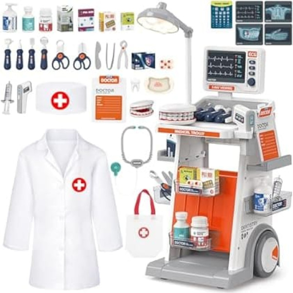 COMPLETE DOCTOR SET This 34 piece doctor and dentist playset includes a variety of realistic medical tools such as stethoscope, syringe, thermometer, dental mirror and toothbrush. Children can use these role play tools to recreate realistic doctor and dental visits while promoting their motor skills and problem-solving skills. Realistic medicine lamp: the set is equipped with an LED medicine lamp, which provides an authentic medical atmosphere. Children can realistically recreate examinations or a neck examination. In addition, the set includes dental tools and a dental model to communicate the topic of dental health in a playful way. FUNCTIONAL DOCTOR CASE CART The handy medical cart allows children to store their tools and push it through the room during play. The trolley also has a handy storage basket on the back where all parts can be neatly stored. So children also learn to keep order. Doctor Outfit Included: The set includes a doctor outfit that helps children fully immerse themselves in their role as little doctors. Wearing the outfit increases fun and promotes creative role play while children develop their social skills and imagination. Safe Materials & Ideal Gift The set is made of high quality plastic and is free from sharp edges, making it safe for children aged 3 and up. It meets all safety standards for children's toys and is the perfect gift for birthday parties, holidays or special occasions. › See more product details
