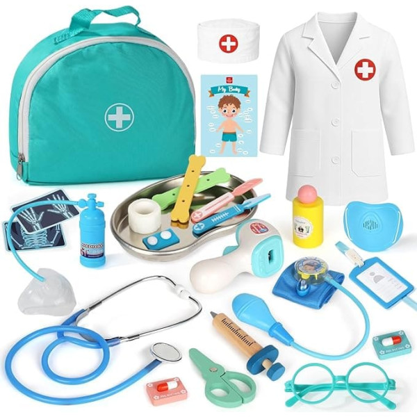 Improved doctor's case for children – as the human organ puzzle contains small parts, there may be a risk of suffocation. For this reason, we have replaced it with an identification card for human body organs, which is more suitable for worry-free use by children over 3 years. Rich medical kit - The Lehoo Castle 36-piece doctor playset has everything children need to play as a doctor, including stethoscope, organ card, stethoscope, oxygen mask, blood pressure monitor, wooden syringe, scalpel and more. Children can get to know the use of various medical aids and have fun with friends Educational toy pretend doctor set - With this fun doctor playset, children learn how to use medical tools and the different parts of the human body. Help children better understand how our organs work, develop empathy, improve social skills, reduce their anxiety and reduce their fear of doctor visits Durable Doctor Playset for Kids - This doctor set is made of high quality wood and ABS plastic, the wooden parts are smooth and durable and the plastic parts are BPA free and non-toxic. These tools have no sharp objects or edges and your child will play with confidence Easy to store and carry: 36 pieces of the pediatrician playset can be stored in a medical bag. Convenient for kids to take with you to start their doctor/nurse role play. Help your child develop the habit of packing toys and keeping the house clean. Happy children, relaxed mom Perfect gift for children aged 3-8 years – attractive package, different doctor's kits make it a wonderful gift choice for children Perfect for birthdays, parties, role play, Halloween gifts, Christmas gifts and more › See more product details