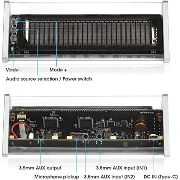 VFD253 integrates mutiple functions into a whole: As an audio spectrum analyzer: adopts dedicated green VFD display screen with 25 × 15 high resolution, guarantee the accuracy of each frequency band. As a Bluetooth receiver and audio switcher: besides microphone pickup, also with Bluetooth 5.0 and 2 groups of 3.5mm AUX input, works perfectly with your phone/PC/game player/amplifier/speaker etc. As a high-precision clock: using RX8025T built-in crystal oscillator whose clock accuracy is ±3ppm, year error within 1 minutes, very cool and interesting. Wide frequency range and special AGC display: 80Hz-16KHz frequency sweep, high-precision display even can do frequency point test. Speical AGC algorithm and customized output curve, ensure ideal visual effects even the input signal is in a small to large range, avoid that no display when input low and display in full screen when input high. Many adjustable items & display effects: gain, brighntness, falling speed of main light column, holding time and falling speed of the peak can be adjusted separately. 5 music spectrum display mode and 2 clock display mode, all settings with power-off memory function, no need to set again after restarting. Attractive looking and convenient use: with remote control, easy to adjsut all settings and see the music level status in real time and every slight change of sound.CNC machined aluminum and transparent acrylic case, both solid and beautiful, compact design not occupy your desktop space. Warm tips: 1. For safe shipping, the remote control may not include batteries (2*AAA), please prepare by yourself. 2. 3.5mm AUX1 and 3.5mm AUX2 cannot input at the same time, only one audio source channel (MIC / Bluetooth / IN1 / IN2) can input at a time. › See more product details; Product description Warm tips: 1. For safe shipping, the remote control may not include batteries (2*AAA), please prepare by yourself. 2. 3.5mm AUX1 and 3.5mm AUX2 cannot input at the same time, only one audio source channel (MIC / Bluetooth / IN1 / IN2) can input at a time. Parameters Display screen: VFD (vacuum fluorescent display). Resolution: 25 × 15. Frequency range supported: 80Hz-16KHz. Display item: music spectrum / clock. Audio signal input: MIC / Bluetooth 5.0 / 2 groups of 3.5 mm AUX Audio signal output: 1 group of 3.5 mm AUX Work mode: 1. Auto mode (display music spectrum when music input, display clock mode when no music input) 2. Clock display mode (always) Clock display: 2 types. Music spectrum display: 5 kinds Music display mode: AGC + customized output curve (real output / smooth output). Adjustable items: main light column falling speed / peak holding time / peak falling speed Brightness adjustment: 5 levels + auto adjustment. Gain adjustment: 5 levels. Power-off memory function: support Remote control: support. Working voltage: DC 5 V. Dimensions(W*D*H): 184*75*66mm / 7.24*2.95*2.60in Net weight: 322 g / 0.71 lb. Package weight: 500g / 1.10lb Packing list: 1 x VFD253 audio spectrum. 1 x USB cable (Type-C). 1 x remote control (without batteries). 2 x pads (stick to the bottom). 1 x user manual.; Product description Warm tips: 1. For safe shipping, the remote control may not include batteries (2*AAA), please prepare by yourself. 2. 3.5mm AUX1 and 3.5mm AUX2 cannot input at the same time, only one audio source channel (MIC / Bluetooth / IN1 / IN2) can input at a time. Parameters Display screen: VFD (vacuum fluorescent display). Resolution: 25 × 15. Frequency range supported: 80Hz-16KHz. Display item: music spectrum / clock. Audio signal input: MIC / Bluetooth 5.0 / 2 groups of 3.5 mm AUX Audio signal output: 1 group of 3.5 mm AUX Work mode: 1. Auto mode (display music spectrum when music input, display clock mode when no music input) 2. Clock display mode (always) Clock display: 2 types. Music spectrum display: 5 kinds Music display mode: AGC + customized output curve (real output / smooth output). Adjustable items: main light column falling speed / peak holding time / peak falling speed Brightness adjustment: 5 levels + auto adjustment. Gain adjustment: 5 levels. Power-off memory function: support Remote control: support. Working voltage: DC 5 V. Dimensions(W*D*H): 184*75*66mm / 7.24*2.95*2.60in Net weight: 322 g / 0.71 lb. Package weight: 500g / 1.10lb Packing list: 1 x VFD253 audio spectrum. 1 x USB cable (Type-C). 1 x remote control (without batteries). 2 x pads (stick to the bottom). 1 x user manual.; Warm tips: 1. For safe shipping, the remote control may not include batteries (2*AAA), please prepare by yourself. 2. 3.5mm AUX1 and 3.5mm AUX2 cannot input at the same time, only one audio source channel (MIC / Bluetooth / IN1 / IN2) can input at a time. Parameters Display screen: VFD (vacuum fluorescent display). Resolution: 25 × 15. Frequency range supported: 80Hz-16KHz. Display item: music spectrum / clock. Audio signal input: MIC / Bluetooth 5.0 / 2 groups of 3.5 mm AUX Audio signal output: 1 group of 3.5 mm AUX Work mode: 1. Auto mode (display music spectrum when music input, display clock mode when no music input) 2. Clock display mode (always) Clock display: 2 types. Music spectrum display: 5 kinds Music display mode: AGC + customized output curve (real output / smooth output). Adjustable items: main light column falling speed / peak holding time / peak falling speed Brightness adjustment: 5 levels + auto adjustment. Gain adjustment: 5 levels. Power-off memory function: support Remote control: support. Working voltage: DC 5 V. Dimensions(W*D*H): 184*75*66mm / 7.24*2.95*2.60in Net weight: 322 g / 0.71 lb. Package weight: 500g / 1.10lb Packing list: 1 x VFD253 audio spectrum. 1 x USB cable (Type-C). 1 x remote control (without batteries). 2 x pads (stick to the bottom). 1 x user manual.