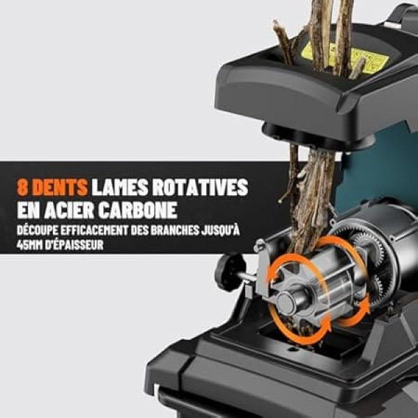 Designed for dry branches, with adjustable cutting gap: the GT10 is designed for shredding dry branches and woody branches up to 45mm in diameter. The adjustable distance between the roller and the counter plate allows adaptation to different materials. A tighter gap provides better grip on thin or leaf-rich branches, while a larger clearance is suitable for thicker dry branches. For best results, no wet or heavily leafy materials should be added. High torque brush motor for powerful and reliable performance: equipped with a 2800 watt brush motor and a robust metal gear, the GT10 delivers torque of up to 400 Nm. This allows for even feeding, faster shredding and reliable shredding of dry wood. The brushless design reduces friction and wear and allows longer continuous operation without overheating or maintenance. 8-Tooth Roller Blade - Even shredding with less clogging: The carbon steel roller blade with 8 teeth retracts branches evenly, reducing the need for manual pushing. Particularly effective on dry wood, it ensures even cuts, ideal for composting or disposal. Compared to conventional choppers, the risk of blockages is significantly lower. Quiet operation – ideal for use in the garden: the GT10 operates at idle with approx. 88dB Thanks to the brushless motor, roller cutting system and sealed gear, the noise remains stable and pleasant even during use. Perfect for use in residential areas or gardens where quiet work is appreciated. Large 55L collection container and easy to move: the 55L safety collection container reduces the frequency of emptying. The sturdy steel frame and large wheels make it easy to transport over different garden surfaces and make working more efficient. COMPLETE KIT WITH FAST CUSTOMER SERVICE Package includes: GT10 chopper, 55L collection box with safety lock, tamping rod and instruction manual. DOVAMAN provides fast customer service - most inquiries will be answered within 48 hours. › See more product details