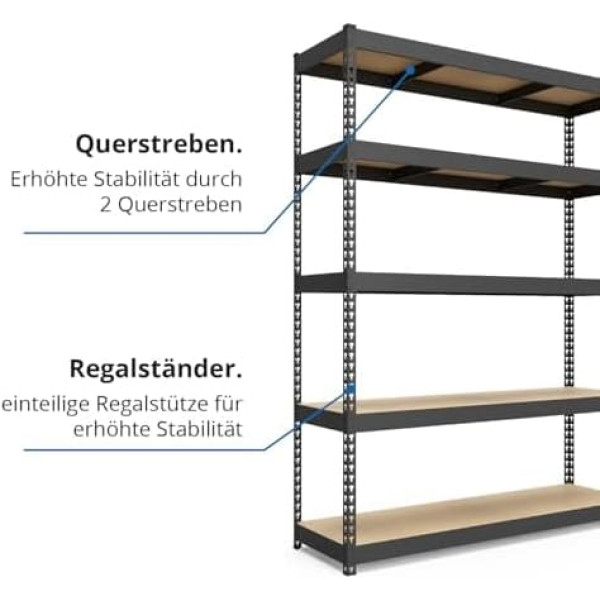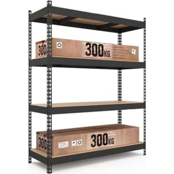 ✔ Lots of storage space: The 4 high-quality MDF shelves offer a load capacity of 300 kg each (with even distribution) for a total load of 1200 kg. ✔ Fixed installation: thanks to the plug-in system, no tools are required for assembly, one person only takes 20-30 minutes to assemble. ✔ Flexibility: The construction is flexible. The height of the individual shelves can be varied at intervals of minimum 4 cm. ✔ Stability: The boltless shelving unit is made of galvanised metal and is powder coated in the black version. Floor and ceiling are protected from damage by plastic protectors. A connection to each other as well as an optional wall securing are possible. Thanks to the powder coating, they can also be used in places with high humidity. › See more product details