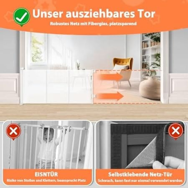 Reinforced extendable stair gate: the upgraded reinforced dog gate has 6 fibreglass reinforced poles (1 fibreglass rod every 18.7 inches), which makes the baby safety gate stronger and less prone to deformation. It prevents the top grid from sagging, deforming, and the lower one lifting. This extendable power gate comes with a floor adhesive hook for optional use. Double reinforcement prevents babies and pets from under the gate Improved lock: The extendable gate has a new \; Product description Reinforced extendable stair gate: the upgraded reinforced dog gate has 6 fibreglass reinforced poles (1 fibreglass rod every 18.7 inches), which makes the baby safety gate stronger and less prone to deformation. It prevents the top grid from sagging, deforming, and the lower one lifting. This extendable power gate comes with a floor adhesive hook for optional use. Double reinforcement prevents babies and pets from crawling under the gate.; Product description Reinforced extendable stair gate: the upgraded reinforced dog gate has 6 fibreglass reinforced poles (1 fibreglass rod every 18.7 inches), which makes the baby safety gate stronger and less prone to deformation. It prevents the top grid from sagging, deforming, and the lower one lifting. This extendable power gate comes with a floor adhesive hook for optional use. Double reinforcement prevents babies and pets from crawling under the gate.; Reinforced extendable stair gate: the upgraded reinforced dog gate has 6 fibreglass reinforced poles (1 fibreglass rod every 18.7 inches), which makes the baby safety gate stronger and less prone to deformation. It prevents the top grid from sagging, deforming, and the lower one lifting. This extendable power gate comes with a floor adhesive hook for optional use. Double reinforcement prevents babies and pets from crawling under the gate.