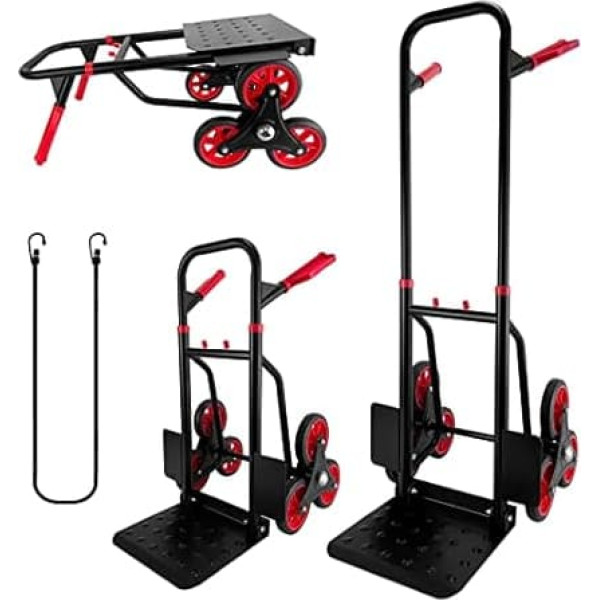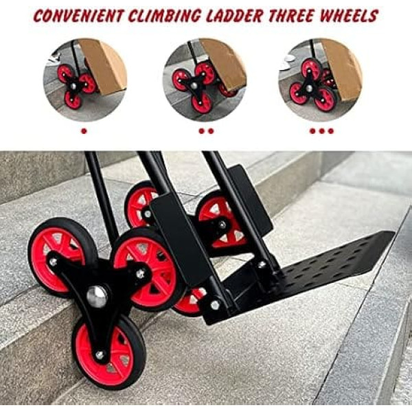 Complies with Human Engineering: The triple support design of our 3-wheel stair climbing folding trolley distributes the weight, making it feel like less dead load - reduces the strain on your back. Height adjustable handle allows you to choose the right height for stairs and flat surface. Collapsible design for easy transport and storage. 【Heavy Duty Stair Climber Hand Truck】The stair climber is made of heavy alloy steel, weighs 26 lbs, heavy trolley provides more reliable transportation, holds up to 330 lbs on flat surfaces, recommended for up to 280 lbs stairs up or down. 5 inch rubber wheels produce no noise and roll smoothly. Includes bungee rope secures loads to sack truck. Height adjustable from 11-44 inches. The operation is simple, the 2-speed height adjustable design, telescopic pole up to 44 inches. Height adjustable handle allows you to choose the right height for stairs and flat surface. The handle is covered with soft rubber foam for comfort and extra grip. Wide application: the luggage trolley is used by travellers, trade fair exhibitors, couriers and anyone else who frequently hauls boxes, making every loading and unloading job fast, easy and safe. The folding size of this handcart is only 29\; Product description 3 Wheel Cart; Product description 3 Wheel Cart; 3 Wheel Cart