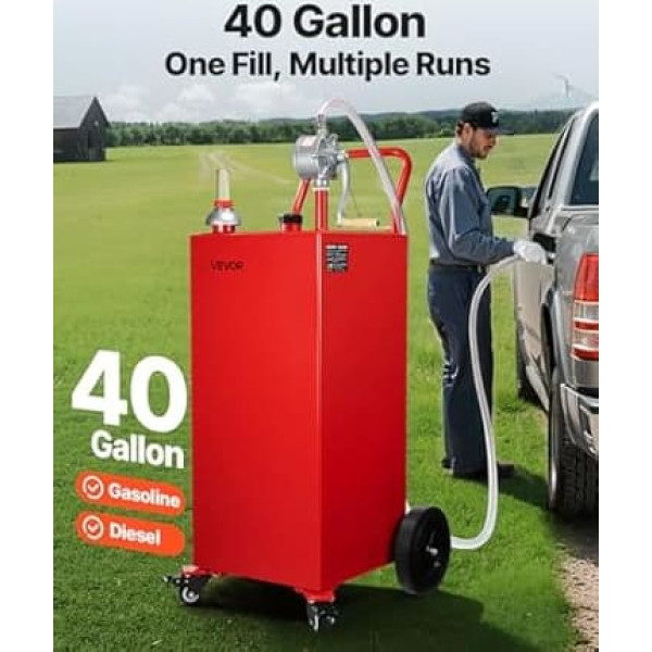 LARGE CAPACITY With a generous 150 litre capacity, this tank truck allows you to easily refuel large equipment or multiple vehicles. Save time and effort with fewer trips and benefit from higher efficiency - whether at home, in the workshop or on an outdoor adventure. Bi-Directional Hand Pump Our tank truck allows easy fuel delivery by rotating the pump in both directions. With a flow rate of up to 4 gallons per minute, it is ideal for places without electricity or with unreliable power supply. Ideal for refueling vehicles or machines on the go. DURABLE AND STRONG This gas tank made of high strength carbon steel is resistant to dents, corrosion and weathering. Whether sun or rain, it keeps your fuel safely and permanently stored, even in the toughest conditions. SAFETY DESIGN Designed with safety in mind, this fuel tank features a kink resistant steel hose, consistent fuel flow and highly visible fuel gauge. The wide inlet prevents spills, while the leak-proof properties ensure a clean and safe refueling process at all times. Wide application: this fuel tank tank is ideal for petrol and diesel and is a versatile tool for refueling motorcycles, lawn mowers, ATVs and more. Ideal for gardening, long road trips or outdoor adventures - it provides ultimate comfort no matter where you are. › See more product details