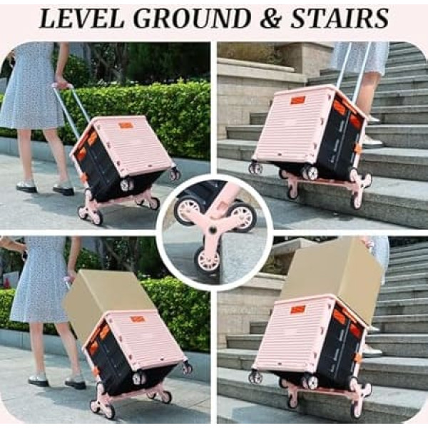 Upgraded Stair Climber Design Considering the optimal maneuverability, this folding utility cart has 10 wheels, 2 360° rotating front silent wheels with brake and 2 rear triple climbing wheels, effectively helps climb up and down stairs, makes every movement easy no matter where you are, and with the brake on the rear wheels, you can easily stop it in a stable state when you There is a practical for various Applications. High Quality Material, Safe and Reliable This folding handcart is made of high quality sturdy eco-friendly polypropylene housing with rustproof aluminum alloy handle (stronger and lighter) and wear and pressure resistant rubber wheels, easy to roll on any road, ensure durability, provide ultimate protection for your valuable contents when you bring them to your destination, such as studio, workshop, classroom, etc. FOLDABLE DESIGN EASY TO STORE This compact rolling box can be easily folded with dimensions 17.3 x 15.7 x 3.15 inches, only a few centimeters thick after folding, saving more space and light weight (4 kg), easy to carry by hand for the actual needs. You can store it in any corner, garage, closet, trunk or under bed when folded. and unfold it for use whenever you need, very convenient. BEAUTIFUL AND FUNCTIONAL DESIGN This heavy duty handcart case has a maximum capacity of 50kg. The telescopic handle with 3 adjustable heights and removable lid allow you to carry different kinds of items such as books, files, classrooms, food laundry or personal items for travel, shopping, camping or moving etc. Perfect gift for your family members friends on different occasions. Easy to Use This fashionable hand truck can be easily assembled by simply unfolding it. The side sliding knob can fix it as a box, with lid, you can load more items on the box or use it as a seat or step stool, or you can remove the lid, hang it on the front to load long items, very versatile. Product under one or more claims licensed US Patent No. 11,565,735 and 11,338,835 Note: If you have any questions, please feel free to contact us. › See more product details; Product description Why choose this foldable, durable utility cart? 1 handy tool for carrying items on the go. The fashionable appearance lets you use it on any occasion without going out of style. 2 Unique 10 Wheel Design - 2 front double wheels with 360° rotating silent brake and 2 rear triple climbing wheels, easy to push or pull or change direction. 3 telescopic aluminium alloy handles allow comfortable use for people of different heights. 4. With lid, it can be used as a seat or step stool if required. Remember to press the brake button on the front wheels to prevent the cart from slipping. 5. Perfect 10 wheel rolling cart for teachers or students to carry books, files or as a storage bin. Product details: Material: PP housing, aluminum alloy handle, rubber wheels Folding box dimensions: 40 x 38 x 8.5 cm. · Unfolded box dimensions: 40 x 38 x 36 cm. 3 adjustable handle height: 51cm, 78cm, 105cm. Climbing wheels and rotating wheels (2 front wheels have brake button). Wheel diameter: 5.5 cm. Package includes: 1 x Folding Utility Cart Note: 1. Before using it, please assemble the wheels first, insert the wheel correctly into the hole of the bottom of the trolley, you will hear a click sound when finished, remember to install the wheels with brake button as front wheels. 2. When unfolding, please remove the lid from the front, loosen the side mounting buckles to unfold the suitcase, put the bottom plate off and slide the side sliding lock into the middle to turn the cart into a sturdy box shape. 3. Please don't forget to put the base plate back in and slide the side slide lock to its original place when you need to fold it. 4. Please do not carry overweight items to ensure long use.; Product description Why choose this foldable, durable utility cart? 1 handy tool for carrying items on the go. The fashionable appearance lets you use it on any occasion without going out of style. 2 Unique 10 Wheel Design - 2 front double wheels with 360° rotating silent brake and 2 rear triple climbing wheels, easy to push or pull or change direction. 3 telescopic aluminium alloy handles allow comfortable use for people of different heights. 4. With lid, it can be used as a seat or step stool if required. Remember to press the brake button on the front wheels to prevent the cart from slipping. 5. Perfect 10 wheel rolling cart for teachers or students to carry books, files or as a storage bin. Product details: Material: PP housing, aluminum alloy handle, rubber wheels Folding box dimensions: 40 x 38 x 8.5 cm. · Unfolded box dimensions: 40 x 38 x 36 cm. 3 adjustable handle height: 51cm, 78cm, 105cm. Climbing wheels and rotating wheels (2 front wheels have brake button). Wheel diameter: 5.5 cm. Package includes: 1 x Folding Utility Cart Note: 1. Before using it, please assemble the wheels first, insert the wheel correctly into the hole of the bottom of the trolley, you will hear a click sound when finished, remember to install the wheels with brake button as front wheels. 2. When unfolding, please remove the lid from the front, loosen the side mounting buckles to unfold the suitcase, put the bottom plate off and slide the side sliding lock into the middle to turn the cart into a sturdy box shape. 3. Please don't forget to put the base plate back in and slide the side slide lock to its original place when you need to fold it. 4. Please do not carry overweight items to ensure long use.; Why choose this foldable, durable utility cart? 1 handy tool for carrying items on the go. The fashionable appearance lets you use it on any occasion without going out of style. 2 Unique 10 Wheel Design - 2 front double wheels with 360° rotating silent brake and 2 rear triple climbing wheels, easy to push or pull or change direction. 3 telescopic aluminium alloy handles allow comfortable use for people of different heights. 4. With lid, it can be used as a seat or step stool i