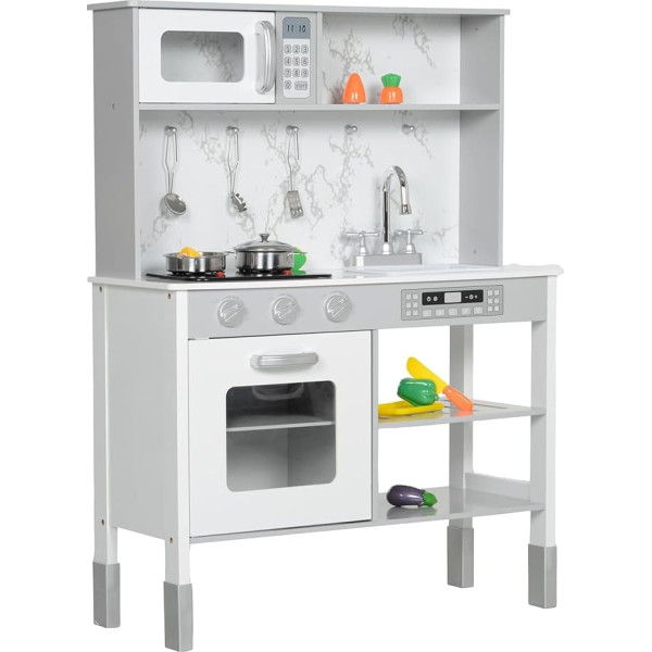 FANTASTIC KITCHEN SET This great toy kitchen with opulent accessories includes six cuttable foods, a tap and a sink that encourage children to conjure up creative delicacies REALISTIC COOKING FEATURES Equipped with an electric stove and microwave, the doll kitchen provides a lifelike gaming experience and allows little chefs to feel like they are in a 5 star kitchen LOTS OF ACCESSORIES AND STORAGE Includes a five-piece cookware set, including pots, pans and lids, plus ample storage space on the shelves and in the lower cabinet to create order and hygiene in the play area The kitchen grows with you: the height of the toy kitchen for children can be adjusted to two heights by levelling feet, 90.2 cm or 96.1 cm, making it ideal for growing children. The robust housing provides more safety when playing Dimensions of the children's kitchen with accessories: Overall dimensions: 70.1L x 28W x 90.2/96.1H cm. Assembly required. Applicable age: 3+ years old Recommended age: 3-8 years › See more product details