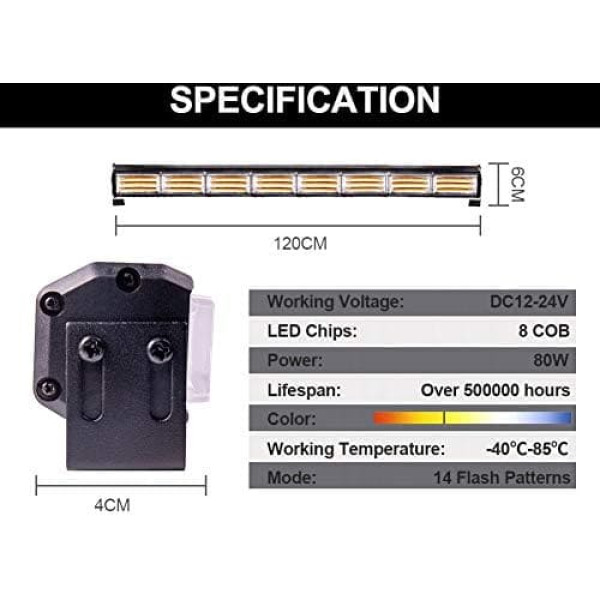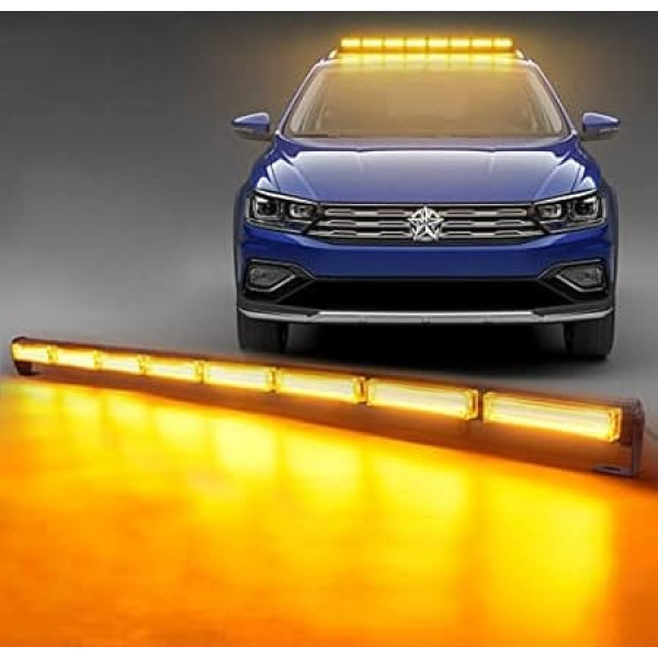 Features: COB LEDs are several LED chips in a single module. This technology ensures a much higher lumen output that is visible in daylight and is also suitable for external indoor installation applications. IP65 Waterproof: The screw is not required to secure the outer housing. The distance between the outer casing is fully sealed, so that no water can enter the interior. The light bar also works completely underwater and is very effective in rain and heavy fog. Easy on/off switch, second switch to switch between 14 different modes, including direction light mode (left, right, centred, outwards, and so on). With the Memory Recall function, you can use the current light mode by flicking on a switch. Easy to use and install (with brackets and fixing screws). For all vehicles with a 12 volt cigarette lighter. Great for BBQ warning lights, bumper lights, dashboard lights, rear deck lights and more, both front and rear. Technical details: 120cm (L) x 6cm (H) x 4cm (D); Power cable: 10ft. High quality, non-stretchable (straight), latest straight cable with 10ft without problems. Ideal for emergency vehicles, post office, construction vehicles, safety warnings etc. › See more product details