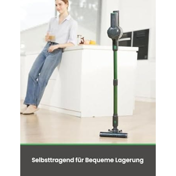 Brushless motor technology: This vacuum cleaner is equipped with a high-performance brushless motor, which offers higher energy efficiency and longer service life compared to conventional brush motors. In MAX mode, it generates a suction power of up to 40 kPa to effortlessly remove dust, dirt and pet hair from all surfaces and carpets - for a quiet and highly efficient cleaning experience. Self-standing vacuum cleaner: This cordless vacuum cleaner has a user-friendly, free-standing design and can be easily placed on the floor at any time. Ideal for short cleaning breaks or emergencies such as unexpected visits, urgent calls or sudden falls of children. The length-adjustable telescopic tube adapts individually and increases cleaning comfort. Running time of up to 50 minutes: With a rechargeable high-performance battery, this wireless vacuum cleaner offers a running time of up to 50 minutes (ECO mode: 50 minutes; Max mode: 25 minutes) and ensures thorough cleaning of the entire house. Two charging options are available: charge via the removable battery grip or directly on the device. Multifunctional accessories and wall mount: this battery vacuum cleaner combines comfort and versatility: thanks to the wall-mountable storage solution, it is space-saving and its lightweight design guarantees easy handling. With multiple brush attachments and a telescopic rod, it quickly turns into a handheld vacuum cleaner - ideal for cleaning sofas, cars, stairs and upholstery. Upgrade floor brush and LED display: the vacuum cleaner is equipped with a flexible floor brush that effortlessly cleans even hard-to-reach areas under furniture. The brush combines bristles and plastic fins to efficiently pick up dust and dirt on floors and carpets and ensure thorough cleaning. The LED display shows battery status and suction mode - so you can flexibly adjust the power as needed. Multi-cyclone system and HEPA filtration: the battery vacuum cleaner is equipped with CycloneFlow technology and a 4-stage multi-cyclone filter system that effectively filters 99.97% of fine particles (up to 0.1 microns). The cone creates 7 high-speed eddy currents that decompose micro dust and prevent filter clogging. The H10 HEPA filter retains 99.97% of small particles, ensuring fresh air. › See more product details