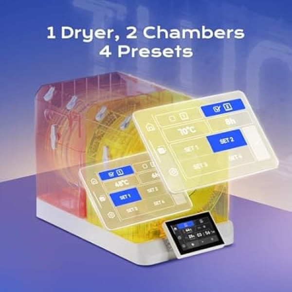 FILAMENT DRYER BOX WITH 4 SPOOLS chitu systems E1 filament dryer box with eight filament holes and PTFE tubes, meets the requirements for drying multiple filaments and allows printing with multiple printers simultaneously Automatic drying: The E1 dryer box has a high-precision humidity sensor and displays the humidity in the interior in real time. Even when the filament dryer is on standby, it will activate when the interior humidity reaches or exceeds 50%, preventing secondary moisture exposure. Thus, it can also serve as your filament storage box DOUBLE FAN & DOUBLE PTC HEATER E1 filament dryer uses two unique 120W PTC heaters to warm up the room; The dryer heats up quickly with a built in fan, circulates hot air 360° for even heating, effectively dries moisture filaments and improves printing results LCD Touch Screen The E1 filament dryer features a 4 inch touch screen for easy operation, making it easy for you to track the drying conditions. It also features pre-configured temperature and drying time settings for commonly used filaments such as PLA, ABS, PETG, PA and PC. This reduces setup complexity and improves your user experience Separate design: space-saving design for storage and drying. Separate heating control for each cassette, the heating floor is designed with two completely independent, separately controllable hot air circulation systems. The touch screen allows users to set different drying temperatures and durations for each cartridge, making it easy for users to use the most suitable drying method for different humidity and different types of materials › See more product details; Product description Chitu Systems Filament Dryer Box, 4 Spools 3D Printing Dry Box for 1.75/2.85mm PLA, ABS, TPU, PETG, Moisture Free Filament Storage with Moisture Control; Product description Chitu Systems Filament Dryer Box, 4 Spools 3D Printing Dry Box for 1.75/2.85mm PLA, ABS, TPU, PETG, Moisture Free Filament Storage with Moisture Control; Chitu Systems Filament Dryer Box, 4 Spools 3D Printing Dry Box for 1.75/2.85mm PLA, ABS, TPU, PETG, Moisture Free Filament Storage with Moisture Control