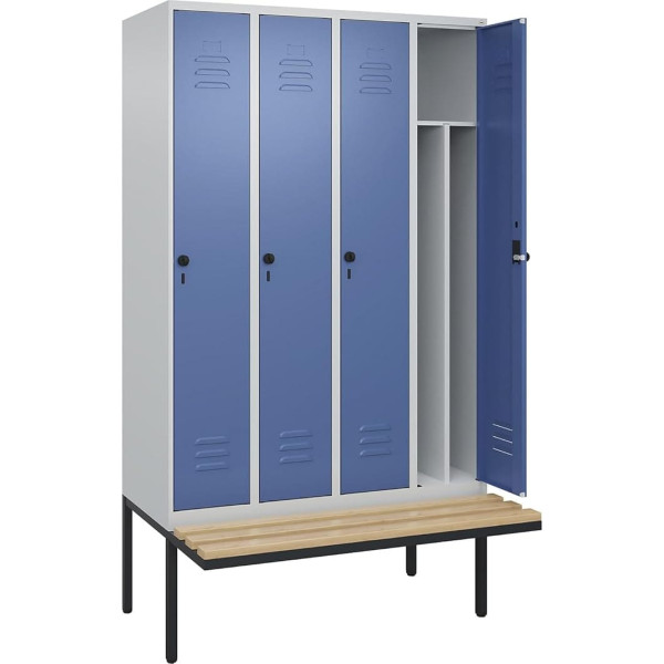 C + P Möbelsysteme C+P | Schwarz-Weiß-Spind Classic Plus Sitzbank | schmal | 4 Abteile | Trennwand verkürzt | lichtgrau/fernblau | B 1200 mm | Sicherheits-Drehriegel | auskragend | Buche-Hartholz