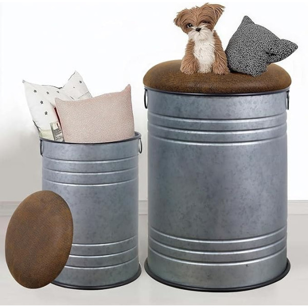 Casolly Ottomane mit Stauraum, verzinkt, silberfarben, 2 Stück, mit rundem, braunem gepolstertem Deckel, rustikaler Beistelltisch, Ottoman-Fußstütze, gepolsterter Sitz für Waschtischhocker, Wohn- und