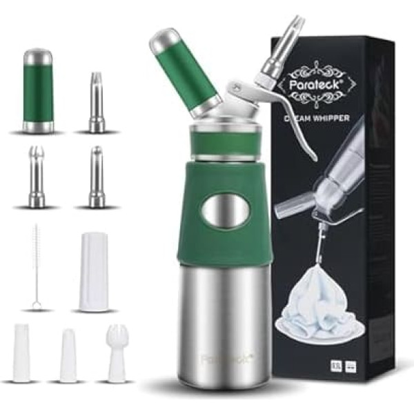 Parateck Cream Dispenser 500 ml Whipped Cream Maker Stainless Steel Cream Syphon with Spray Nozzles Cleaning Brush (Green)