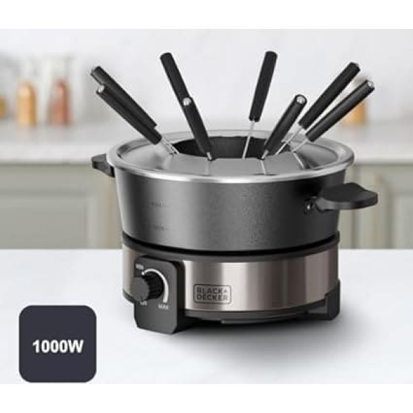 Black+Decker - Elektrisches Fondueset BXFC1000E | 1000 W | Thermostat bis 200 °C | 2 L Fassungsvermögen | Für Käse, Schokolade, Brühe & Öl | 8 Gabeln | PFOA-frei | Spülmaschinengeeignet
