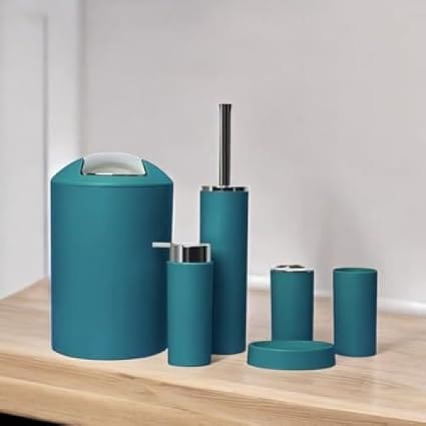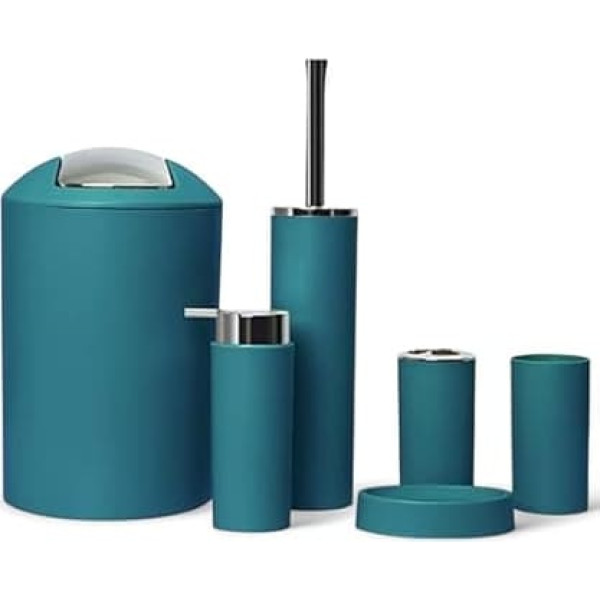 6-Piece Bathroom Accessory Set Organiser: Soap Dispenser, Toothbrush Cup, Cosmetic Bin, Toilet Brush and Holder, Soap Dish, Rubbish Bin, Toothbrush Holder, Bathroom Set (Dark Turquoise Design 2a)