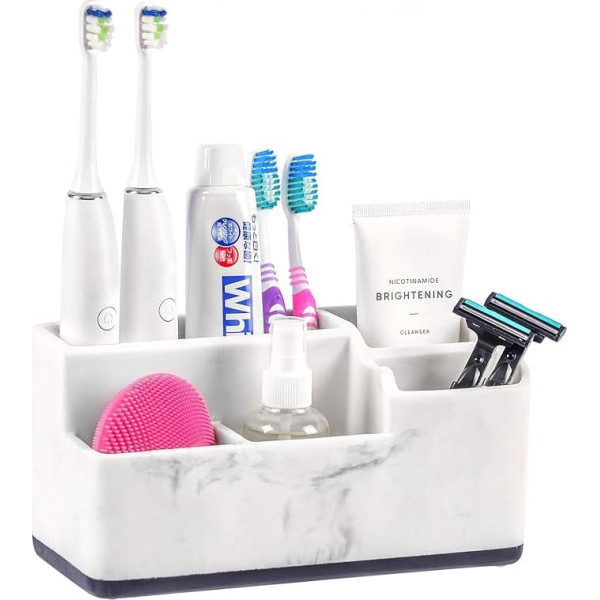 High-quality materials: the toothbrush holder is made of high-quality natural resin, which is durable and not easy to break. The unique marble-like toothbrush holder is resistant to high temperatures and is not easy to soften or release odors. And the water absorption rate is very low, and it is not easy to mould and rust in the long-term damp bathroom. Unique design: this resin bathroom organiser has 4 non-slip foot pads to ensure that it does not tip over. The tiered design gives you many ways to store your toothbrush, toothpaste, facial cleanser and more. Drain holes: Each compartment at the bottom of the toothbrush holder has small drainage holes through which standing water can be drained in time. Keep the inside of the toothbrush organiser dry to avoid the formation of bacteria and mould. Easy to clean: The toothbrush holder can be easily cleaned by wiping it with a damp cloth or rinsing it with water. Electric toothbrushes, razors, combs, floss and makeup brushes can be placed neatly on this surface for organization and storage. Save space and stop cluttering up your bathroom, vanity, kitchen, desk and other messy countertops. Customer service: Our professional customer service team offers you professional advice before sale and customer service. If you encounter any problems when using our products, please contact us and we will contact you immediately. › See more product details