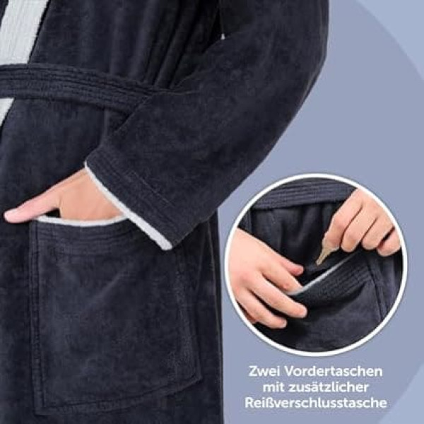 100% cotton – Our bathrobes for women are characterised by their velvety outer layer (velour) and the absorbent loop material inside (terry cloth). So the women's dressing gown is not only pleasantly soft, but also highly absorbent. Comfortable fit – thanks to the belt with belt loops, the sturdy women's bathrobe adapts perfectly to your body and offers you an optimal fit. No slipping or shifting. Fashionable colours – whether as a dressing gown or as a sauna bathrobe for women, the unusual colour contrast ensures a stylish look and is available in four different designs. Machine washable at 60°C. Pocket with zip – so that you can safely store your keys, the women's terry bathrobe has a zip pocket. Additional items can be stored in the two spacious front pockets Tested for harmful substances – our carefully processed materials guarantee durability and optimal absorbency. Our breathable cotton bathrobe has been tested for harmful substances according to Oeko-Tex Standard 100 (certificate number: 20.0.23116). › See more product details