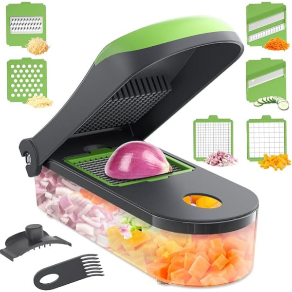 Reduce kitchen preparation time - Premium Nicer Dicer Chef 1200 ml, accessory cutter contains 1 container, 1 knife holder, 1 safety slider, 1 pressure lid, 6 sharp stainless steel blades, ergonomically designed to easily chop onions, carrots, potatoes, fruits and other ingredients, significantly reduces kitchen preparation time and improves cooking efficiency. Food grade material - grater for vegetables is made of food-safe PP and 420J2 stainless steel, BPA-free, keeps the original health and nutrition of the ingredients. With this mandolin vegetable slicer, you can be sure that you can prepare healthy, tasty, nutritious and creative dishes for your family. Multifunctional use: vegetable slicer cuts, dices, julienne and purees not only vegetables, but also baby side dishes, salad side dishes and sauces; the safety sliding handle ensures that you do not cut your fingers when using it. Our vegetable cutter is versatile in the kitchen and is ideal as a gift for housewarming, Mother's Day and Christmas. Versatile - This vegetable cutter simply pushes the lid down and chops vegetables and fruits in 3 seconds; the safety sliding handle ensures that you do not cut your fingers while using it. Multifunctional and portable cutting design, suitable for the kitchen at home, or wild camping, caravan use. To make better use of the product, please read the instructions (English language not guaranteed) carefully. DISHWASHER CLEANING - The multifunctional mandolin kitchen can be easily disassembled for convenient use and cleaning, or clean in the dishwasher. It can also be used as a storage box to store your knives and keep your kitchen organised. If you have any questions, please contact our team in Barcelona to solve them in a timely way! › See more product details