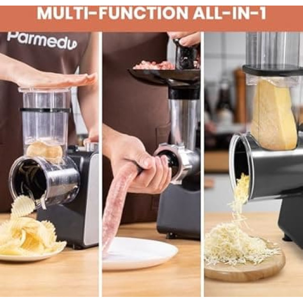 Electric multi-chopper: Discover ultimate versatility with the electric vegetable cutter and meat grinder from Parmedu This automatic kitchen grater is designed to crush vegetables, cheese into different shapes as well as meat, thus optimising meal preparation. Multifunctional vegetable slicer and cheese grater: Our multifunctional vegetable raspler and cheese grater effortlessly turns vegetables into precise slices, wavy slices, thicker or finer strips. With 5 attachments, the electric vegetable cutter offers maximum versatility. The spiral cutter is also ideal for grinding cheese (except hard cheese), cookies, breadcrumbs and nuts. Please note that accessories can be used. If you have any problems, please contact us with your contact details for replacement! Multifunctional meat grinder & sausage filler & kibbeh maker: In meat grinder mode, the meat machine offers a professional meat grinder experience with two slices, a sausage kit and a kibbeh kit. Simply place pieces of meat and ingredients into the wider filling funnel and do both grinding and making sausage/kibbeh in one step. Patented design: our electric chopper is characterised by an automatic fast rotating drum, a wider filling funnel and a hand guard that makes it stand out from the competition. This thoughtful design ensures safer, smoother and faster feeding, saving time and effort in the kitchen. No more fighting with bigger ingredients! Easy to clean: We strongly recommend cleaning all accessories under warm water. They are not dishwasher safe to ensure the longevity of the components. Whether you are a professional chef or a home cook, the versatile Parmedu electric kitchen grater and meat shredder allows you to explore a variety of recipes and take your culinary creations to a new level. Excellent gift: The unique design, high-quality workmanship, multilingual manual and exquisite colour packaging make the Parmedu electric spiral cutter an ideal gift for any occasion. Parmedu offers a 12-month warranty. If you have any questions, you can contact us at any time. › See more product details