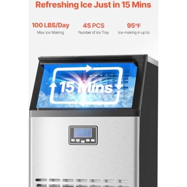 VEVOR Commercial Ice Maker (100lbs/day) Ice Maker with 33lb Storage Capacity, 45 Ice Cubes in 15 Minutes with LED Digital Display & 2 Ways to Add Water for Bar Restaurant