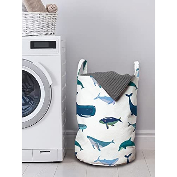 ABAKUHAUS Whale Laundry Bag, Swimming Sea Creatures, Laundry Basket with Handles and Drawstring Closure for Launderettes, 33 x 49 cm (W x H), Teal/Dark Blue/White