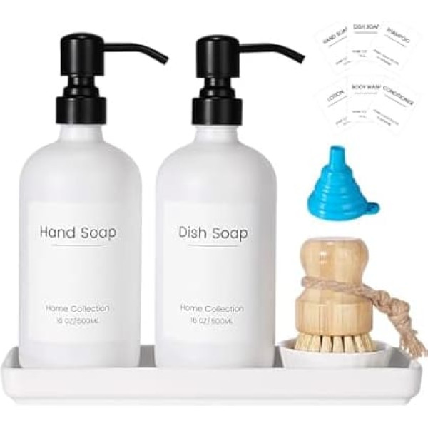 WHAT YOU WILL GET This glass soap dispenser set will surprise your kitchen. The package includes 2 x 17 oz detergent dispensers, 1 brush, 1 small ceramic bowl, 1 ceramic tray, 6 sticky note labels and 1 funnel - everything you need for your daily needs. High Quality The kitchen soap dispenser is made of high quality materials, including lead-free glass bottles and rust-proof stainless steel pumps. Designed for durability, the enclosed labels are also waterproof and durable. MODERN FARMHOUSE DESIGN The glass kitchen soap dispenser set combines contemporary farmhouse style with elegance and order. It is ideal for dishwashing liquid, hand soap, lotion, body wash gel, shampoo and conditioner dispenser, etc. VERSATILE AND ECO FRIENDLY These reusable glass dispensers refill with your favorite soap, reducing plastic waste and promoting sustainability. GREAT GIFT IDEA Whether for yourself or a loved one, this soap dispenser set makes an excellent gift for various occasions and will add a dash of luxury and functionality to any home. › See more product details