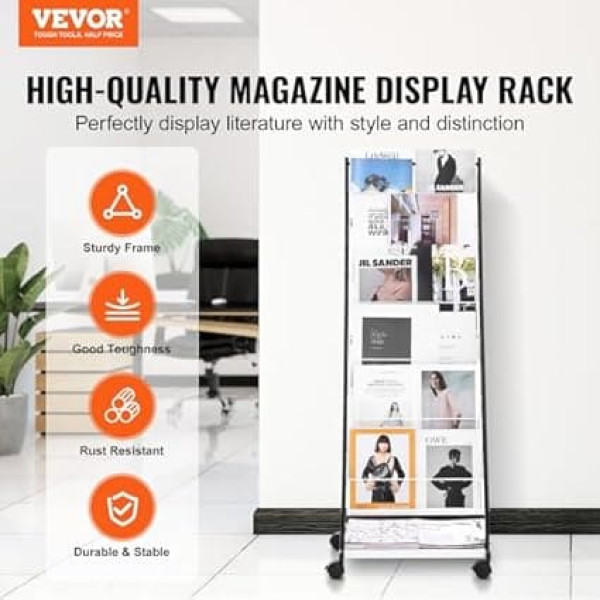 QUALITY WORKMANSHIP, LASTING DURABILITY The VEVOR 6 compartment brochure stand is crafted with precision and undergoes a high temperature stove-enamel process to achieve a smooth and durable finish. NO MORE WORRY ABOUT DEFORMATION - This brochure stand is built to withstand the test of time. LOTS OF SPACE TO ORGANIZE Our magazine rack with file holder features 6 levels of generously sized display grids, each with space for 2 x A4 magazines. It offers ample space to neatly organize newspapers, brochures, magazines, literature and more. Keep your brochures neat, organized and easily accessible. KEEP IT TIDY, SHOW IT CLEAR Each shelf is designed with a grid pattern to optimize airflow, ensure proper ventilation and minimize dust accumulation. This thoughtful design keeps your display shelf clean and tidy, prevents brochures from slipping, and improves both aesthetics and functionality. EFFORTLESS MOBILITY Equipped with 4 smooth-running 360° swivel wheels, this magazine and catalog brochure rack is easy to move. In addition, 2 lockable wheels with reliable brakes ensure that the stand stays stable and secure, so you can place it anywhere you need it. VERSATILE & FASHIONABLE Our floor-standing movable brochure stand assembles easily and fits seamlessly into different environments from offices and libraries to hotels and trade shows; it's your solution for the stylish and distinctive presentation of magazines. › See more product details