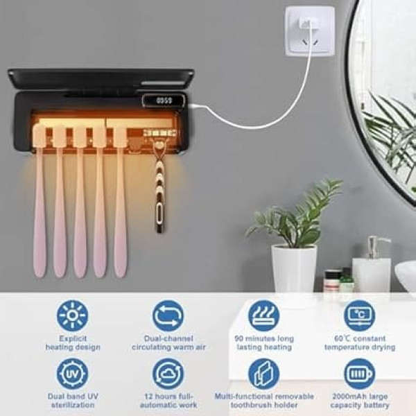 99.9% sterilisation effect: no external power supply and only one button to enjoy a healthy toothbrush. Toothbrush disinfectant can clean 99.9% of bacteria on the toothbrush. This is a perfect toothbrush holder for your bathroom Heated mode: this UV toothbrush holder switches automatically every 12 hours through all 3 modes to ensure that you and your family have a clean toothbrush when brushing teeth. Press the button to turn it off while it is working Size and material of the product: the toothbrush sanitizer holder size 21.3 x 5.6 x 7.6 cm. The toothbrush holder is made of ABS material. Please note: the heating function must be connected to the socket to work Large capacity battery: the UV brush holder has a built-in 2000 mAh high-performance battery, waterproof and durable. High capacity, long battery life, available for 30 days after full charge. Please charge the device for 4 hours before first use Easy installation: wall toothbrush holder with high-strength stickers for mounting on smooth walls without drilling strong adhesive, wall-mounted toothbrush holder. Easy to install, no drilling, no tools required, well attached, will not fall off or break the wall › See more product details