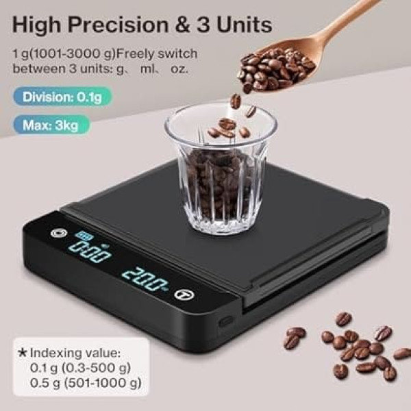 0.1 g accurate weighing: the digital coffee scale supports accurate weight measurement in the range of 0.1 g to 3 kg and offers multiple unit conversions of g, ml and oz. It has a built-in LCD display that can accurately measure and display coffee beans, milk and liquids, fruit, food and other items. High-quality material: electronic kitchen scales made of high-quality ABS and PC materials, it is beautiful, durable and easy to clean. It has a size of 13 x 15 x 1.9 cm and a weight of only 0.28 kg, making it easy to clean and save space. Multifunctional: you can set the automatic or manual mode, and the countdown and countdown functions make it easy to record the coffee brewing time. The tare function can accurately measure the weight of cups and other containers, allowing you to enjoy your coffee time. The detailed steps can be found in the user manual. Waterproof and rechargeable: It has good IPX7 waterproof rating, so you don't have to worry about it not being used due to spills. It has a built-in 300 mHa lithium battery and a TYPE-C interface charged and serves the stable power supply of the kitchen scale. Wide range of applications: the kitchen scale is ideal for baking, cooking, etc. It is suitable for measuring vegetables, fruit, cereals, rice, flour, meat, etc. You can accurately control the amount of food. Please note that when using, please place the object in the middle of the scale tray, otherwise the accuracy of the measurement may be affected. › See more product details