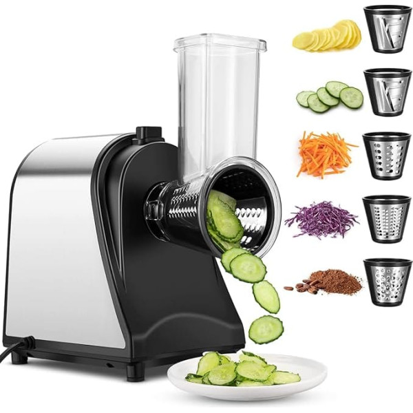 Perfect vegetable grater: automatic multi-grater with 5 different interchangeable cutting inserts, which are coarse friction cone, fine grating cone, thick disc cone, thin disc cone, grinding cone, meet your different requirements Easy to use: quick and easy at the touch of a button. With a maximum power of 550 W ensures convenient and quick cutting, grating, grating and grinding fruit, vegetables, cheese, nuts and chocolate Easy to clean: all attachments are easily removable. It is compact and space-saving and suitable for everyday use High-quality materials: BPA free. The strong grater not only looks very good with its chic stainless steel housing, but also very dirt-repellent and wipes clean in just a few moments Box contents: 1 x salad slicer, 5 x cone blades, instruction manual (English language not guaranteed). Dimensions: 11.5 x 19 x 20 cm, rated power: 250 W › See more product details
