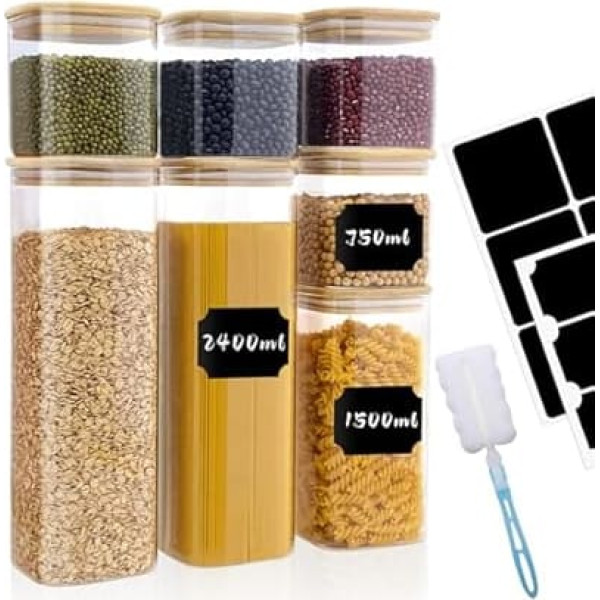 7 Glass Containers with Lids: the set of large glass containers contains 4 pieces 750ml, 1 piece 1500ml and 2 pieces 2400ml storage boxes for kitchen, comes with 16 reusable labels for marking stored food, 1 pen and 1 cleaning brush. Adjust different sizes to meet your different needs Durable thick glass: the glass storage jars with lids are made of 2.2 mm transparent borosilicate, BPA-free, odourless and non-toxic. And the lids are smooth and burr-free. The bottom of the bottle can be easily cleaned with the included brush or put directly in the dishwasher. Hands free Keep food fresh: the lid with a silicone ring all around creates a moisture-resistant environment to keep food and cereal fresh and dry. The air holes in the silicone balance the air pressure and loosen the lid adhering to the glass so that it can be easily opened Space-saving: square storage jar wooden lids are stackable to save space and keep the kitchen or cabinet tidy. Clear labels and transparent bottles can help you recognize the food and access it faster. Nothing makes a well-organised kitchen more comfortable MULTIPURPOSE JARS The large glass storage box is ideal for storing long spaghetti, also for storing pasta, nuts, candy, cookies, cereal, beans and other foods you like. Perfect addition to your kitchen! Note: Please do not store liquids or flip bottles. When you receive the product, please press it against the pearl cotton from the bottom to easily remove the glass › See more product details