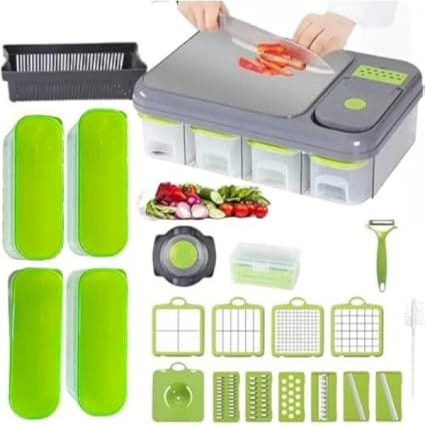 Versatile: the multifunctional board is ideal for smoothly transforming fruits and vegetables such as potatoes, cucumbers, carrots, radishes, etc. into different shapes: cubes, sticks, quarters, eighths, slices, filaments, julienne. Practical set: this 28 piece set consists of a large vegetable cutter manual and chopping board large with 4 plastic containers & drip tray, 10 interchangeable stainless steel blades, egg separator, vegetable peeler, grater hand guard and 1 brush. Stable and user-friendly: with non-slip feet and finger protection, the chopping board with grater ensures more stability and safety. With its ergonomic design, the chopping board with collection container offers maximum convenience in the kitchen. High-quality workmanship: with 10 extra-sharp blades made of 304 stainless steel, and a robust design made of BPA-free plastic (ABS + PET), the grater with container allows effortless cutting, precise results, durability and safety. Thoughtful design: the chopping board with bowls comes with 4 stackable containers made of durable plastic with lids, which can also be used separately as food storage containers to keep prepared ingredients hygienically in the fridge. › See more product details; Product description Bring order and efficiency to your kitchen - with the multifunctional chopping board with drip tray and lid. This mandolin vegetable slicer with bowl impresses with its versatility, quality, perfect workmanship and super easy to use. The perfect kitchen aid that combines functionality and order - XXL multifunctional chopping board with drawer and lid Ideal for cutting, preparing and storing food - without the mess in the kitchen. Whether as a classic chopping board, serving plate or storage box - this chopping board set is a real all-rounder. Product details: Material: high-quality plastic ABS + PET and 304 stainless steel. Dimensions: 43 x 13.5 x 30 cm. Colour: grey/green/transparent. Box contents: lid with 1 large chopping board and lever, 4 drip trays with 4 lids, 1 drip tray, 10 interchangeable stainless steel blades in different sizes, 1 egg separator, 1 vegetable peeler, 1 grater hand guard and 1 brush; Product description Bring order and efficiency to your kitchen - with the multifunctional chopping board with drip tray and lid. This mandolin vegetable slicer with bowl impresses with its versatility, quality, perfect workmanship and super easy to use. The perfect kitchen aid that combines functionality and order - XXL multifunctional chopping board with drawer and lid Ideal for cutting, preparing and storing food - without the mess in the kitchen. Whether as a classic chopping board, serving plate or storage box - this chopping board set is a real all-rounder. Product details: Material: high-quality plastic ABS + PET and 304 stainless steel. Dimensions: 43 x 13.5 x 30 cm. Colour: grey/green/transparent. Box contents: lid with 1 large chopping board and lever, 4 drip trays with 4 lids, 1 drip tray, 10 interchangeable stainless steel blades in different sizes, 1 egg separator, 1 vegetable peeler, 1 grater hand guard and 1 brush; Bring order and efficiency to your kitchen - with the multifunctional chopping board with drip tray and lid. This mandolin vegetable slicer with bowl impresses with its versatility, quality, perfect workmanship and super easy to use. The perfect kitchen aid that combines functionality and order - XXL multifunctional chopping board with drawer and lid Ideal for cutting, preparing and storing food - without the mess in the kitchen. Whether as a classic chopping board, serving plate or storage box - this chopping board set is a real all-rounder. Product details: Material: high-quality plastic ABS + PET and 304 stainless steel. Dimensions: 43 x 13.5 x 30 cm. Colour: grey/green/transparent. Box contents: lid with 1 large chopping board and lever, 4 drip trays with 4 lids, 1 drip tray, 10 interchangeable stainless steel blades in different sizes, 1 egg separator, 1 vegetable peeler, 1 grater hand guard and 1 brush
